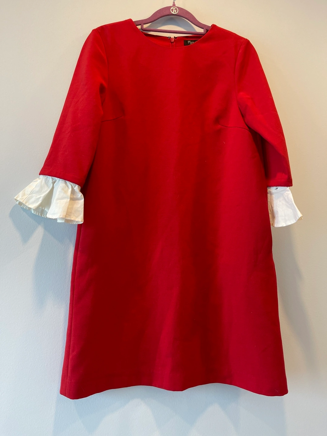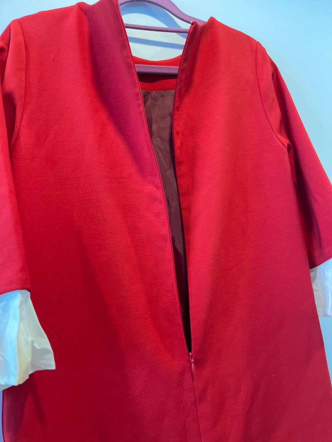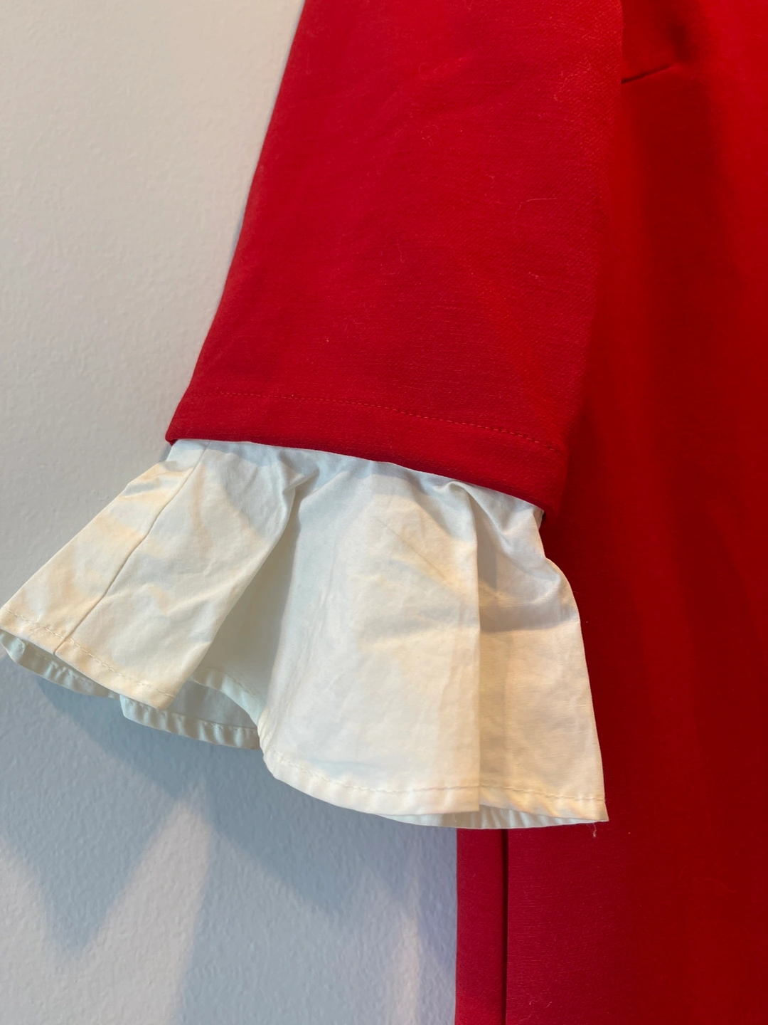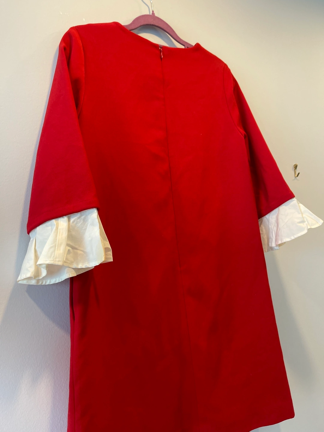 A red dress with white ruffled sleeves. The sleeves are attachable, you can wear it without sleeves.