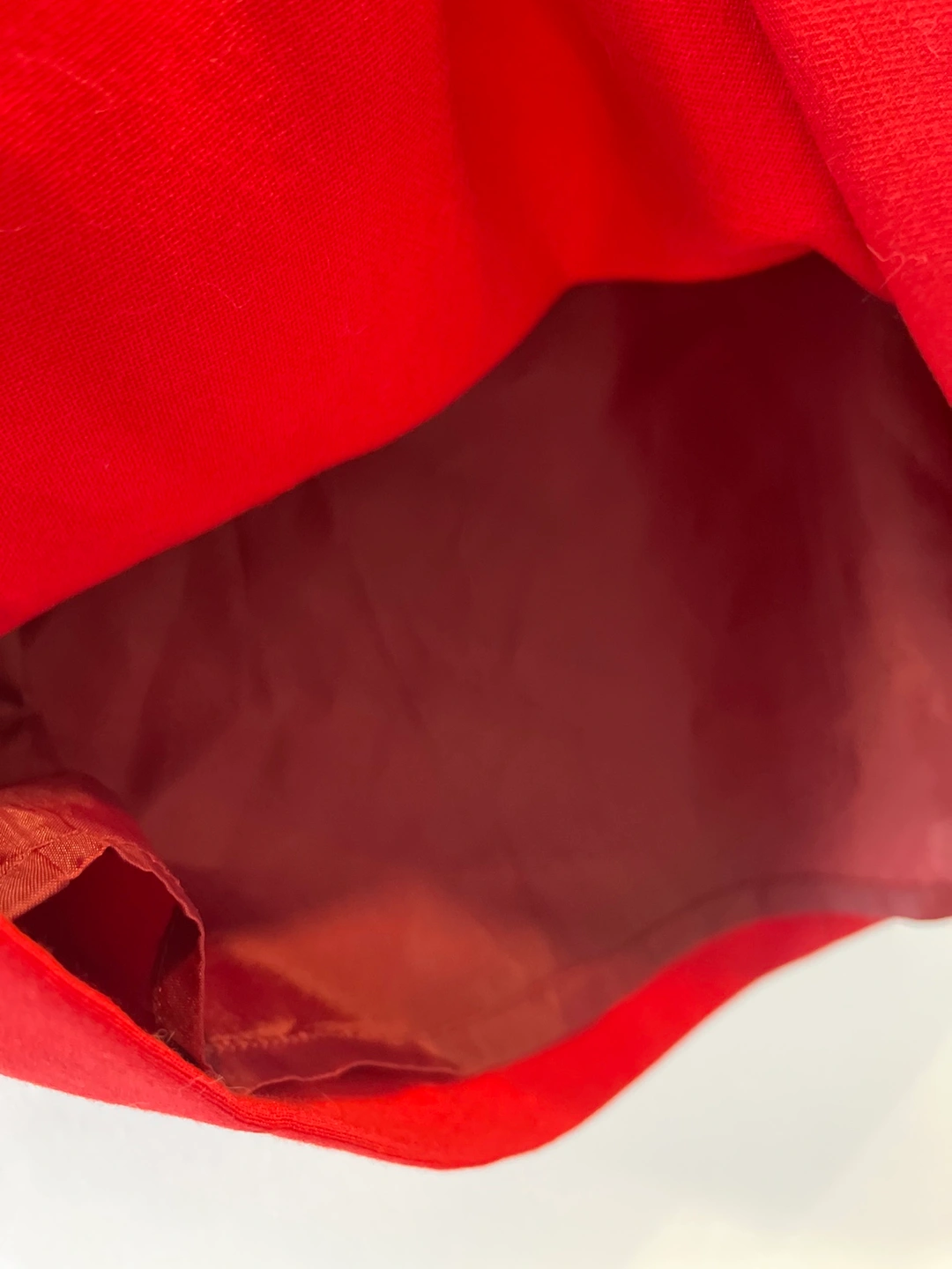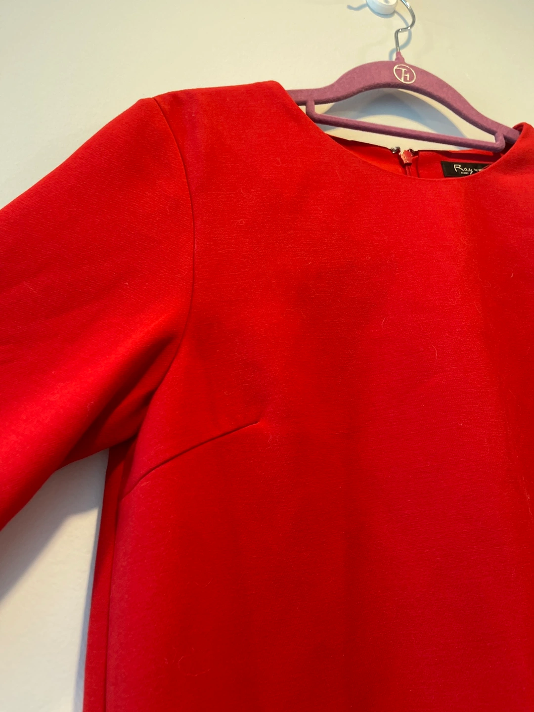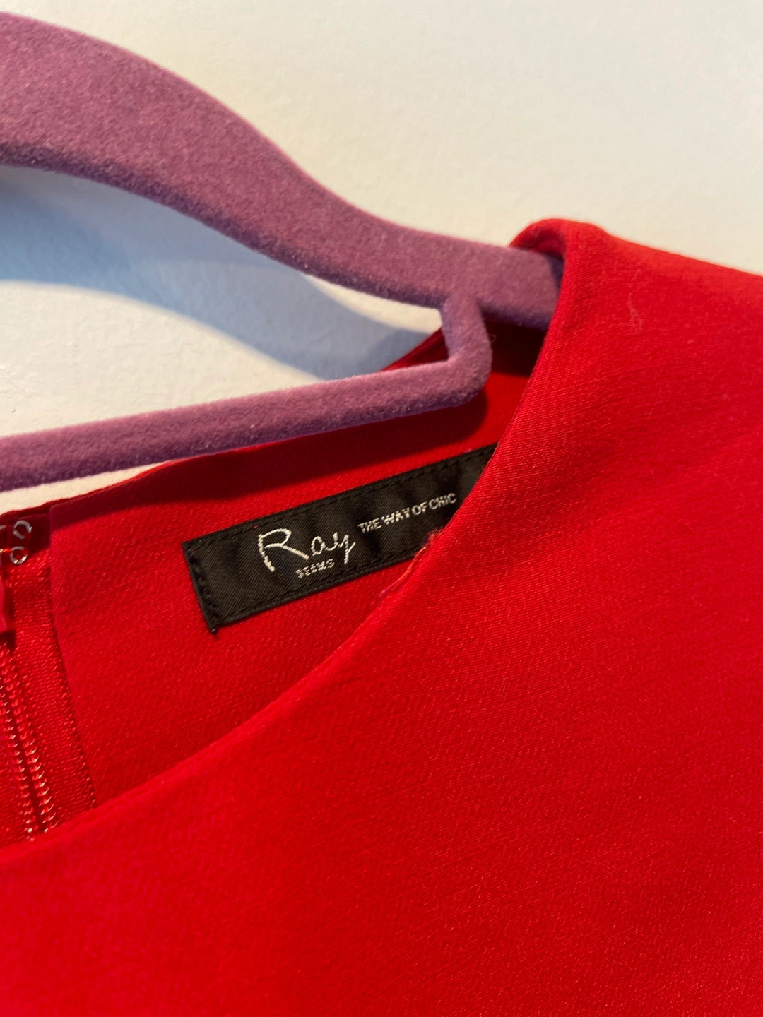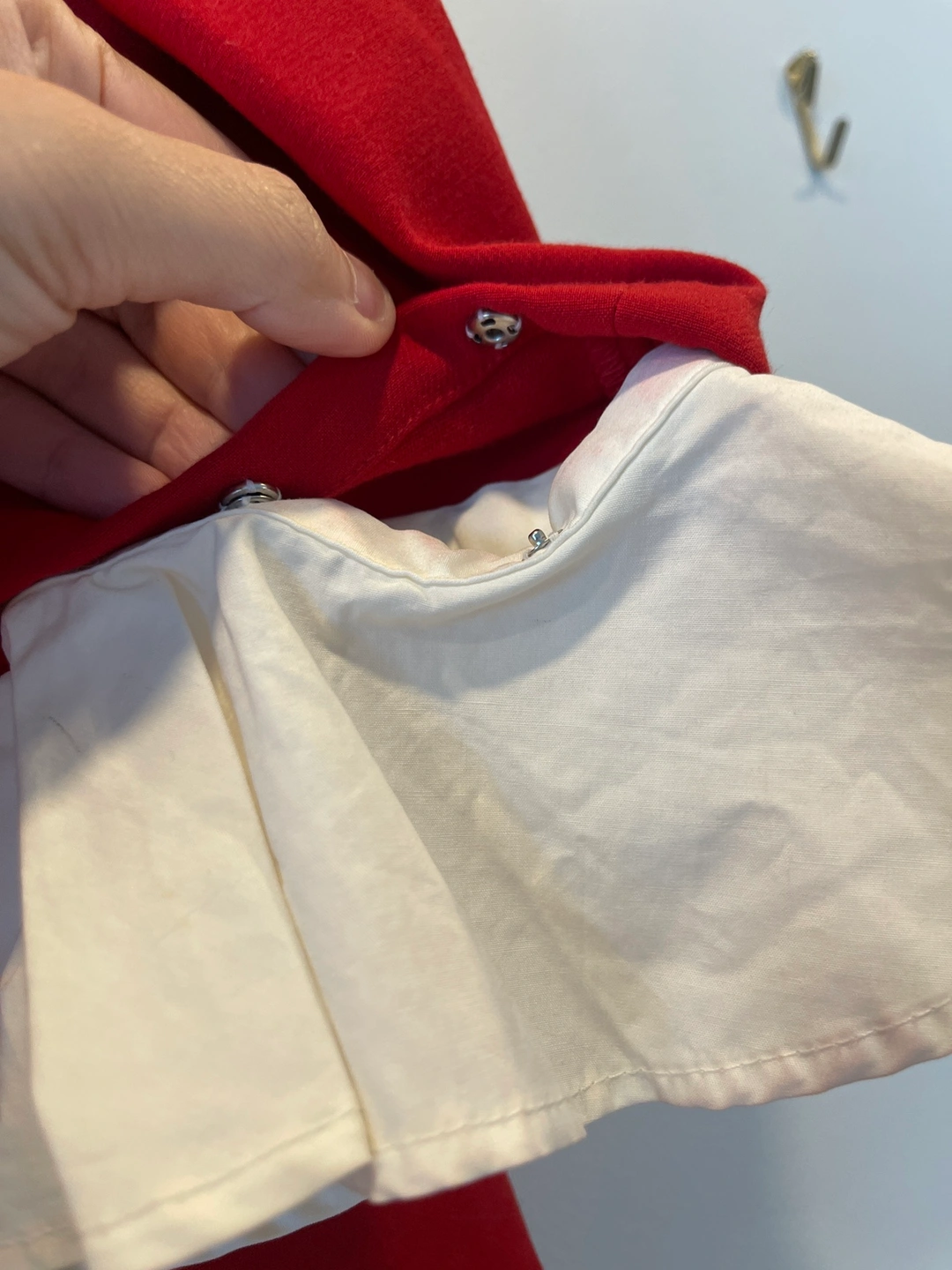 A red dress with white ruffled sleeves. The sleeves are attachable, you can wear it without sleeves.