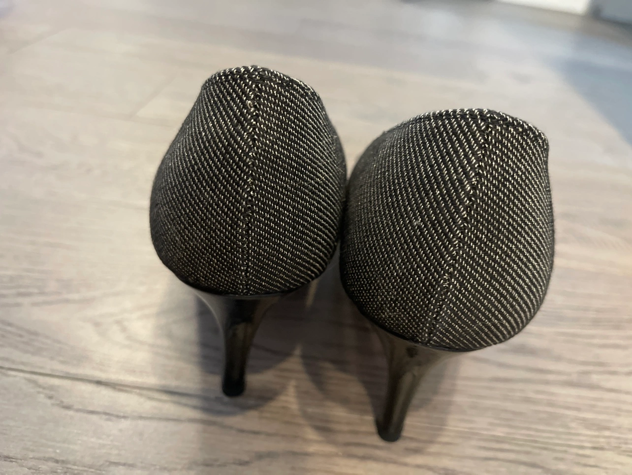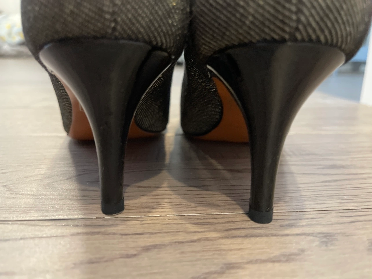 1000+Black peep toe heels with black bow accent and gold accents on the toe. Height 2.5inch Size 22.5cm