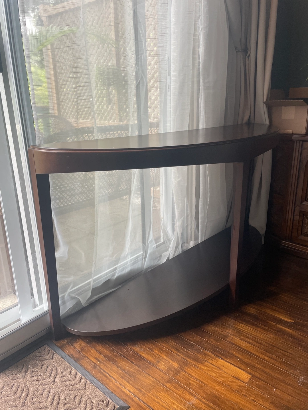 Dark brown solid wood console table with a curved design. It has one shelf. Gently used.