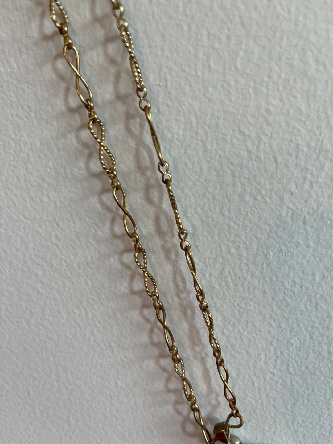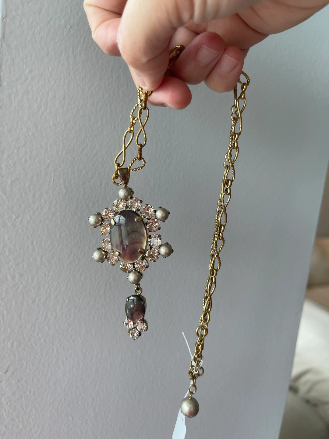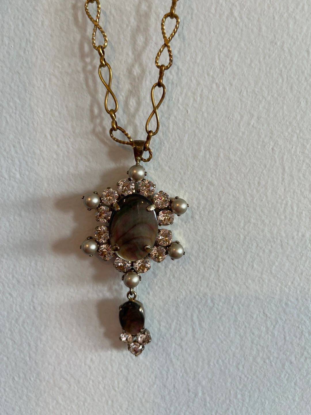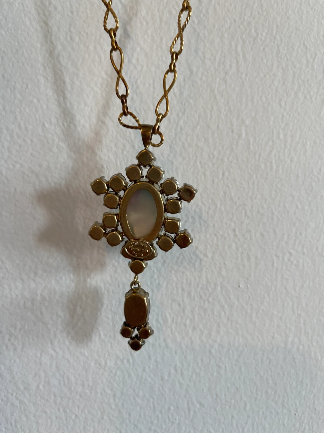 1000+This is a gold chain necklace with a pendant that features a large oval-shaped mother of pearl surrounded by rhinestones and pearls. Made in France Length adjustable