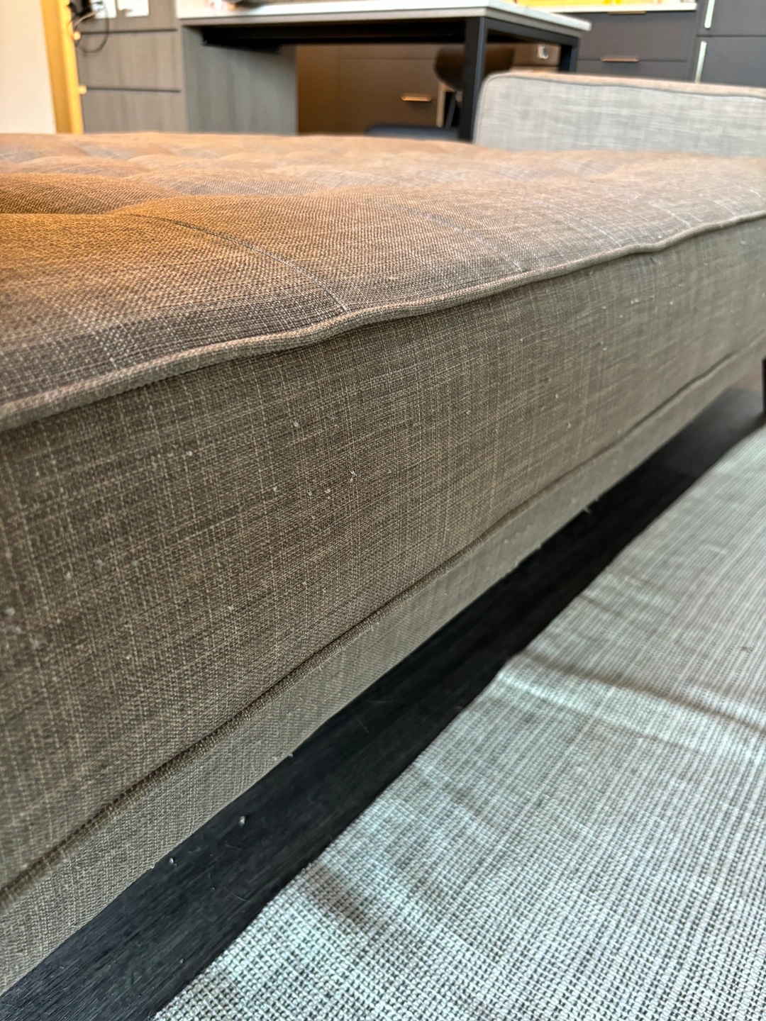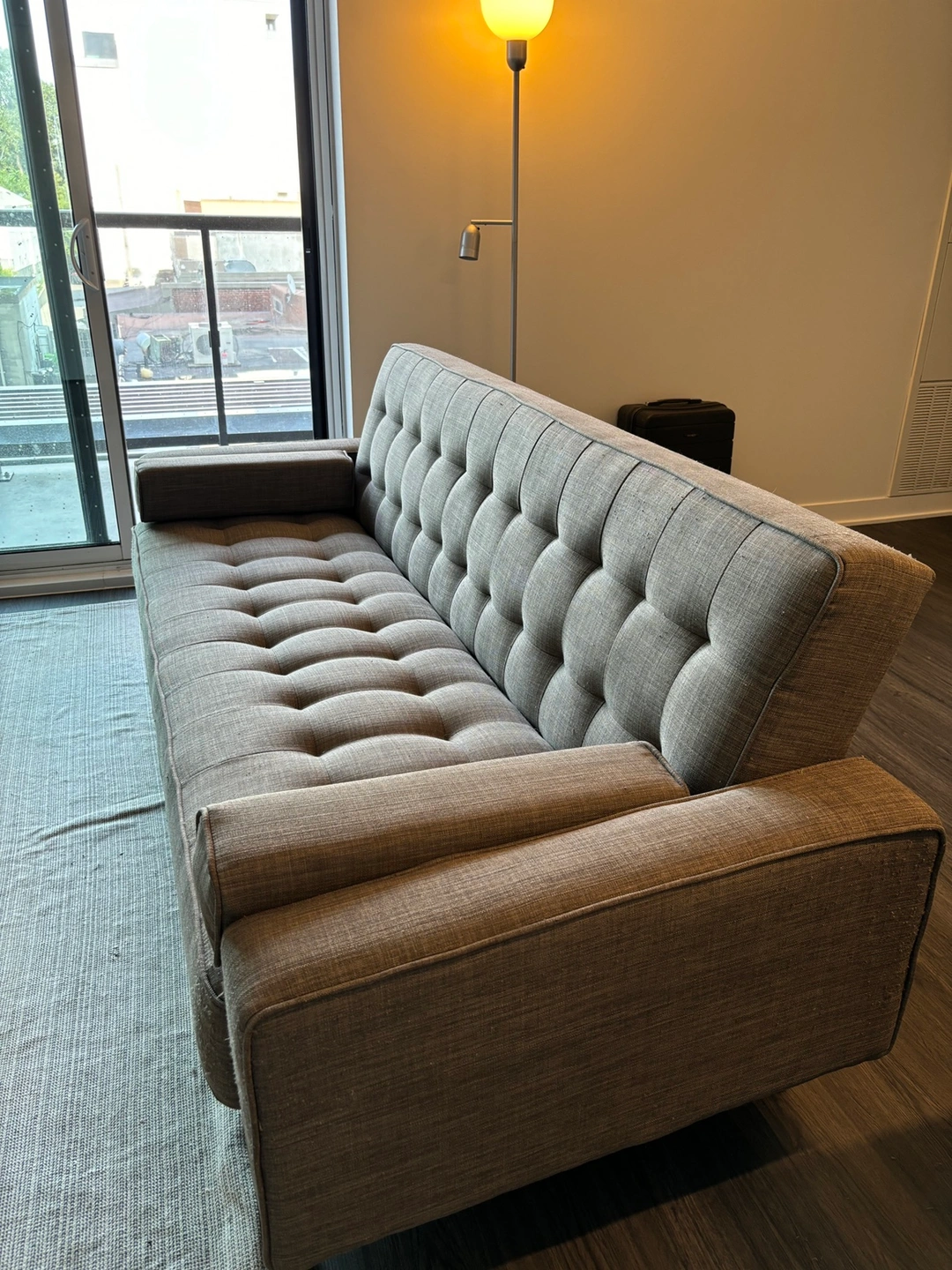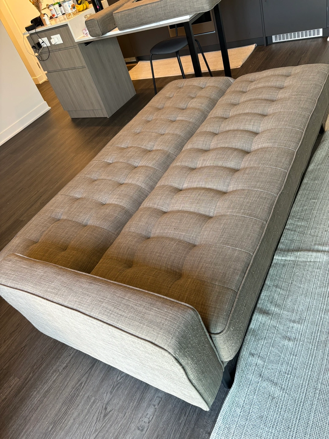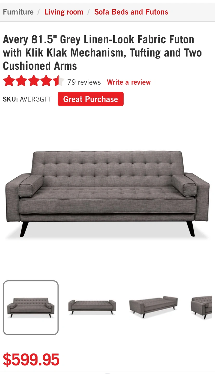 - Grey futon sofa bed. Includes a klik-klak mechanism and tufting.