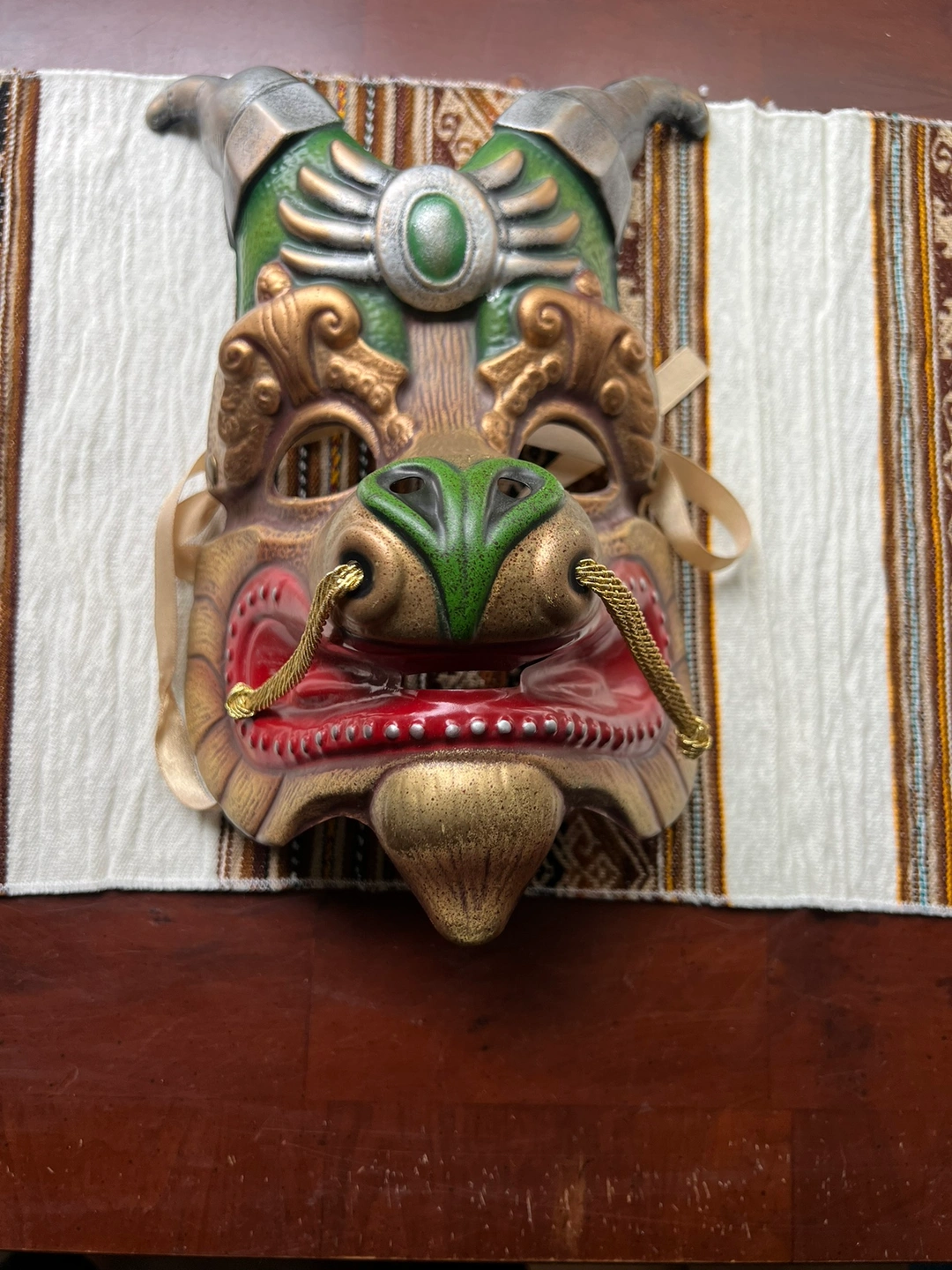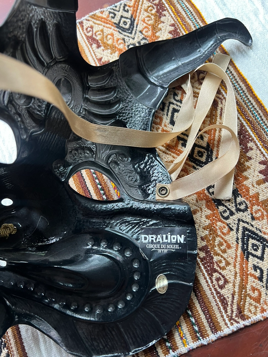A mask from the Cirque du Soleil show Draion. It is made of hard plastic and features a green, gold, and red colour scheme. It is attached to a tan ribbon. The back of the mask is black and features the Draion logo.