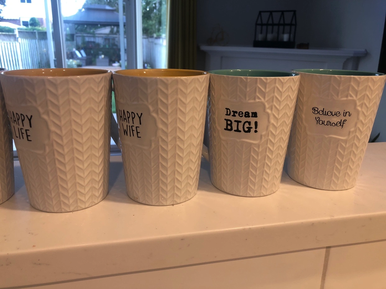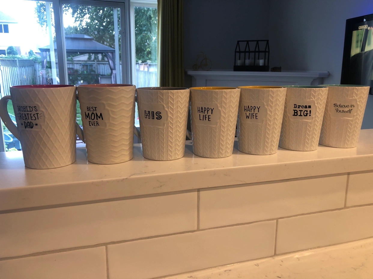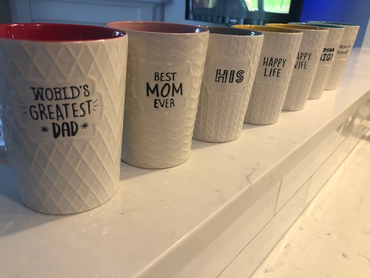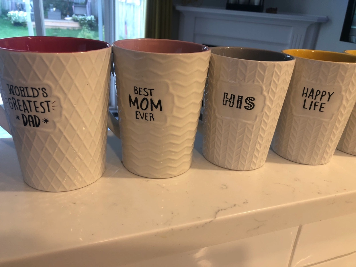 These are a set of 7 mugs with various sayings. The sayings on the mugs are "World's Greatest Dad", "Best Mom Ever", "His", "Happy Life", "Happy Wife", and "Dream Big".