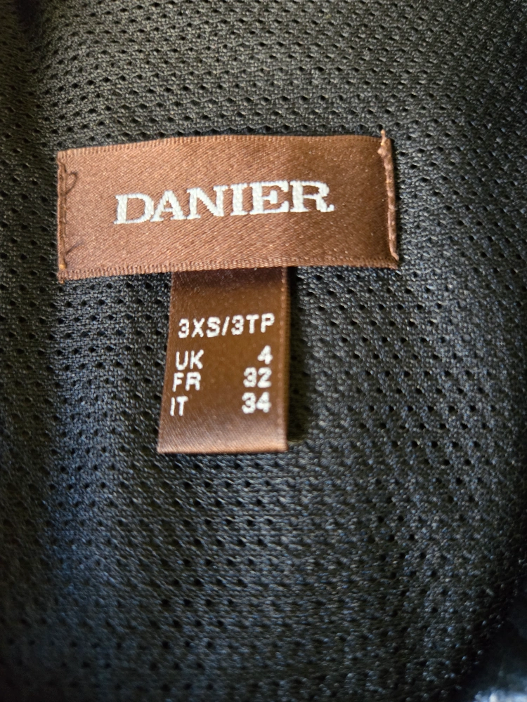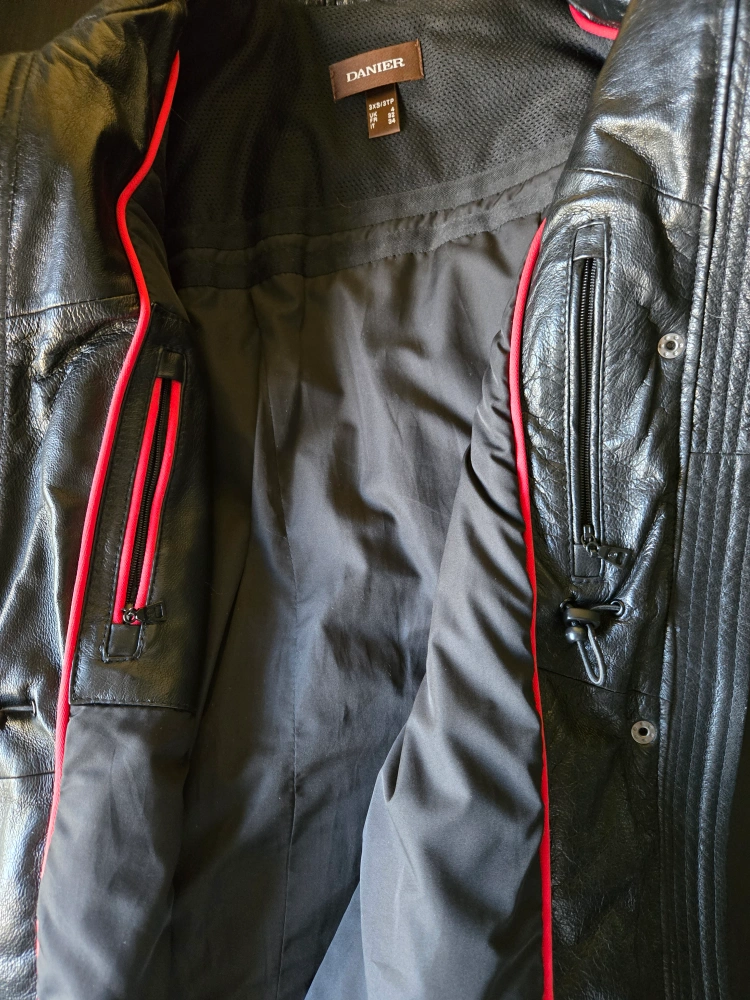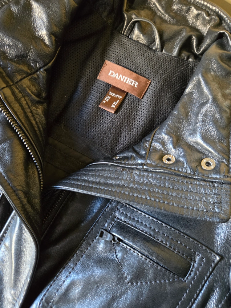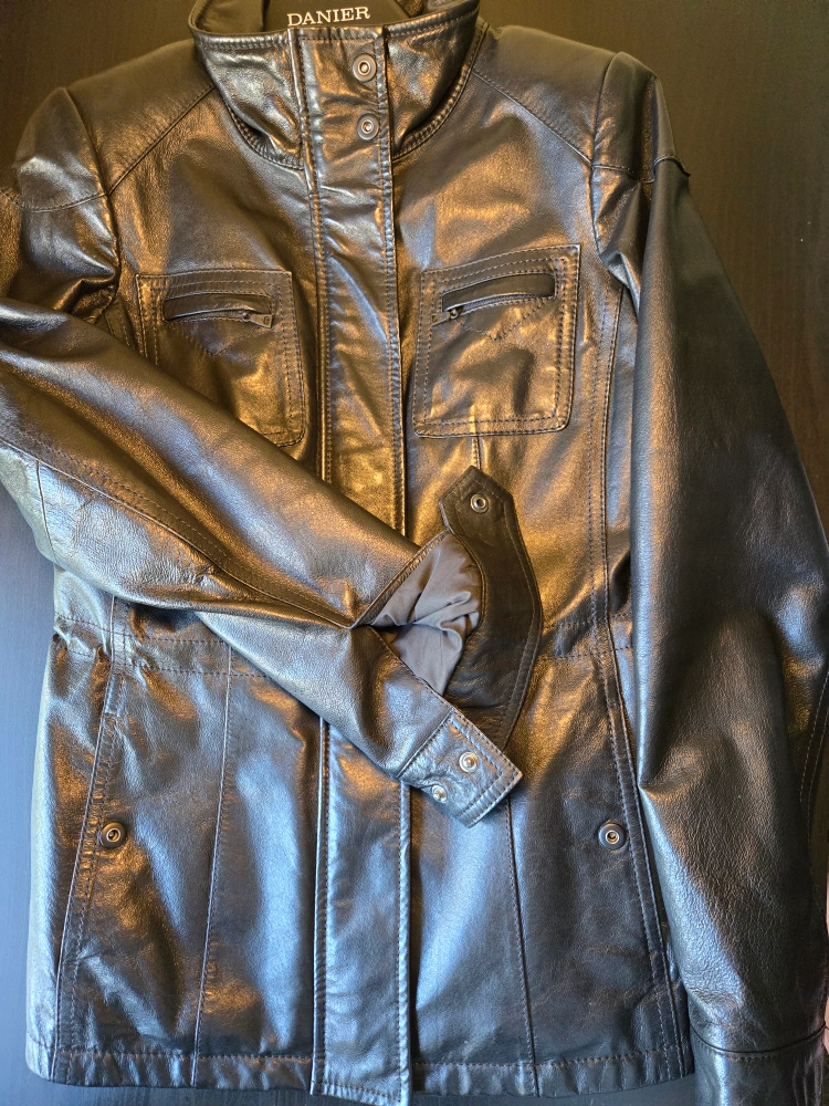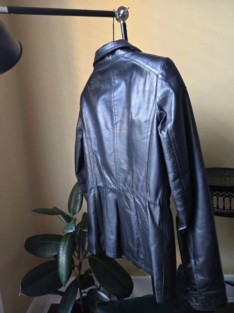 222Black genuine leather jacket with multiple pockets. The jacket has a cinched (adjustable) waist. like new , worn only few times and then lost in my closet