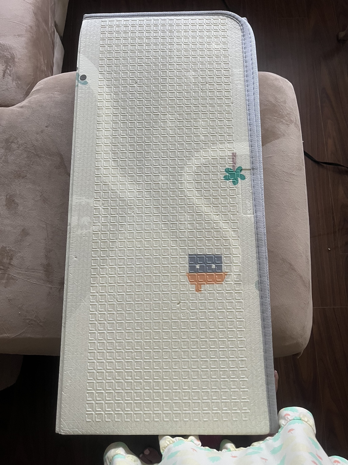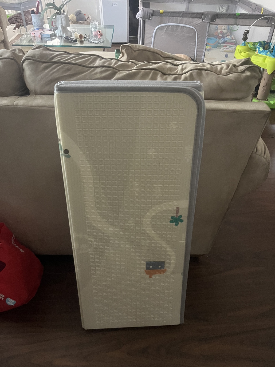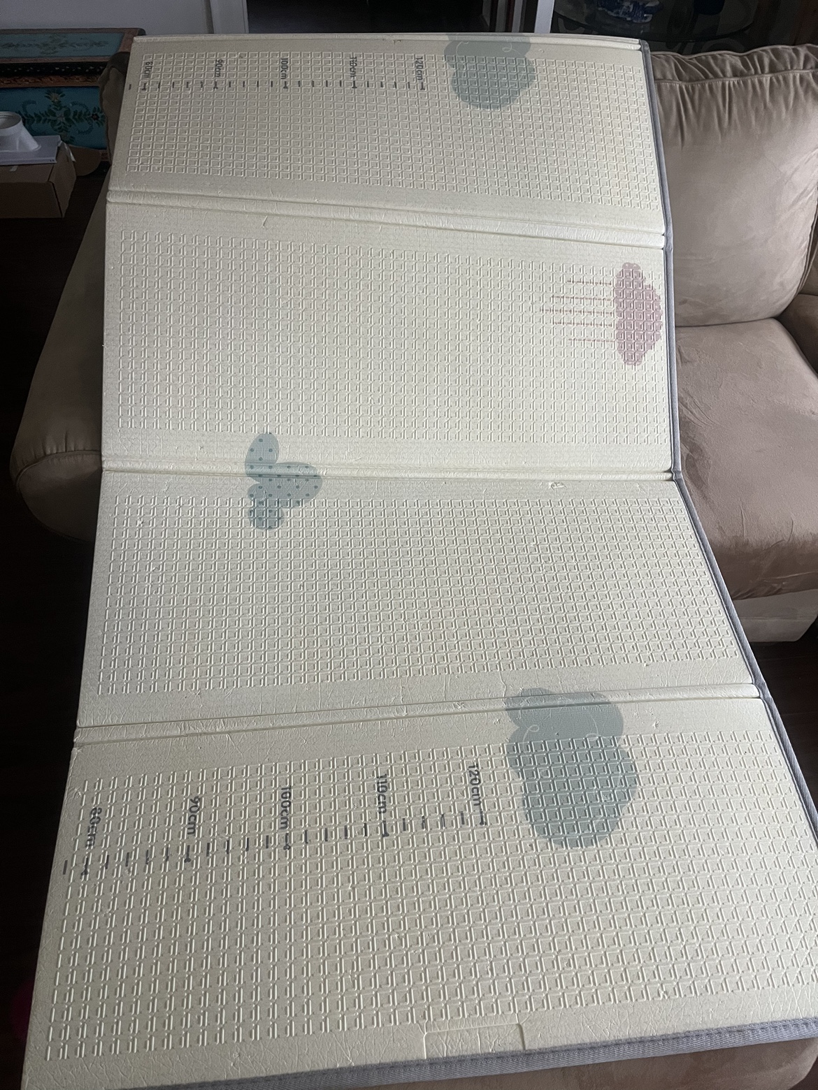 Foldable play mat with various designs. It comes in four panels and folds compactly for easy storage.