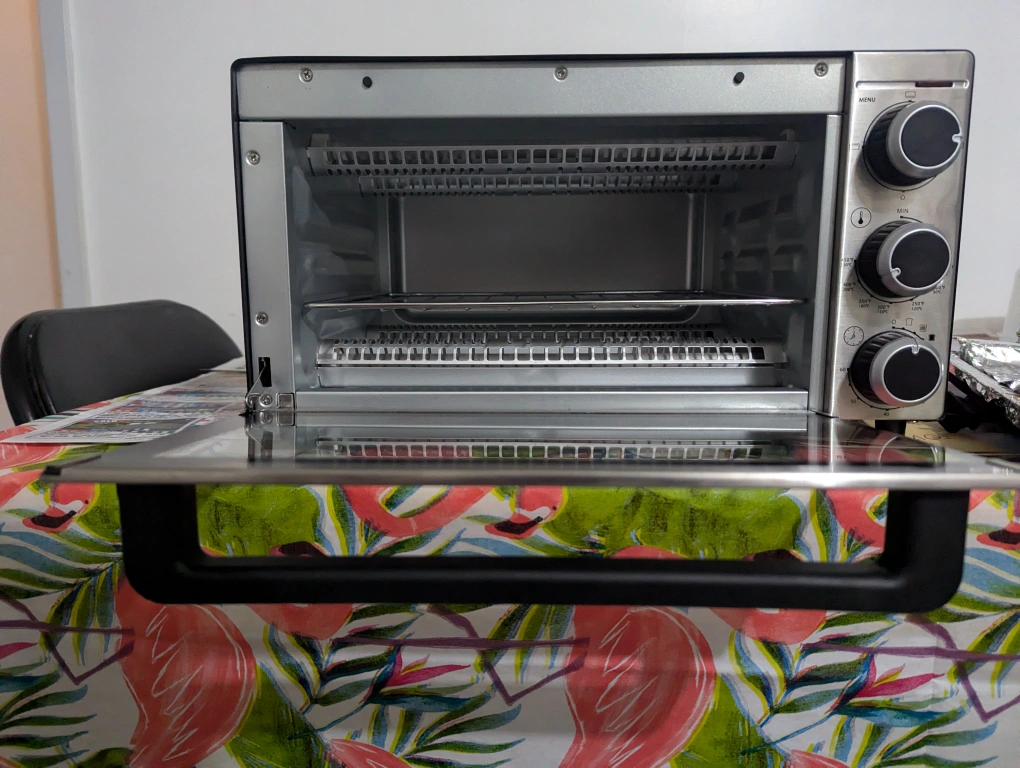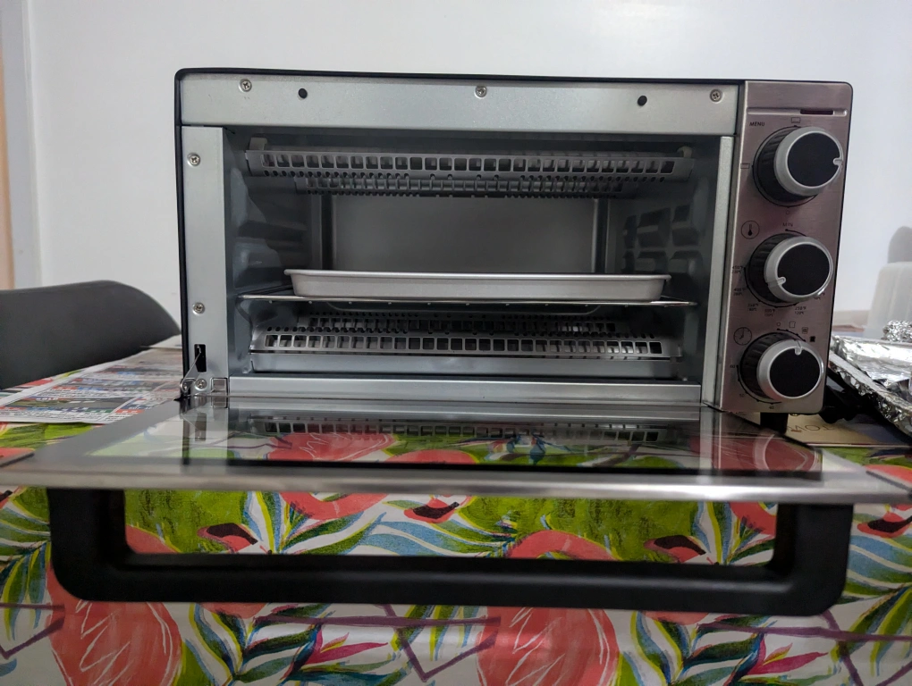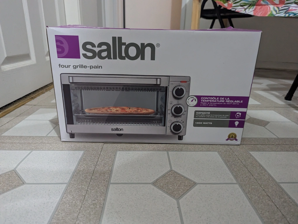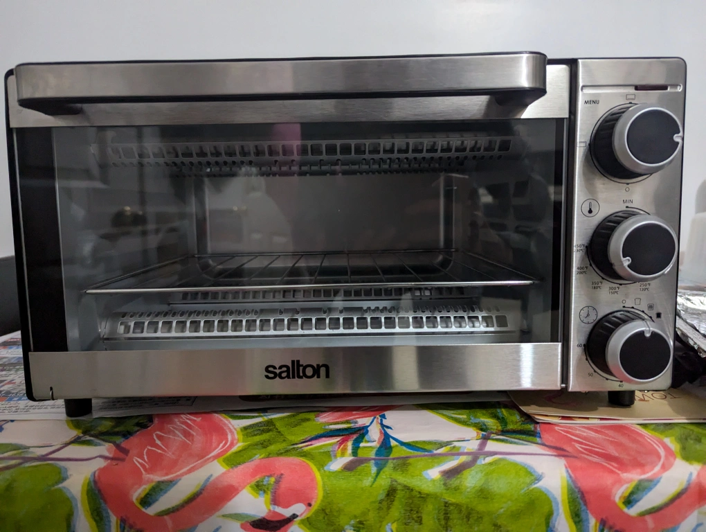This oven is in excellent condition and comes with the original packaging, includes a baking pan, wire rack, and crumb tray.