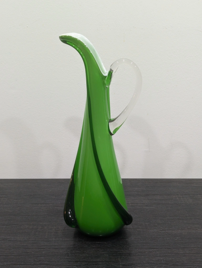 Elevate your dining experience with our Vintage Empoli Art Glass Carafe. This hand-blown masterpiece showcases stunning shades of green, embodying Mid Century Modern elegance. Perfect for serving water, wine, or your favorite beverages, this rare find adds a touch of sophistication to any table setting.