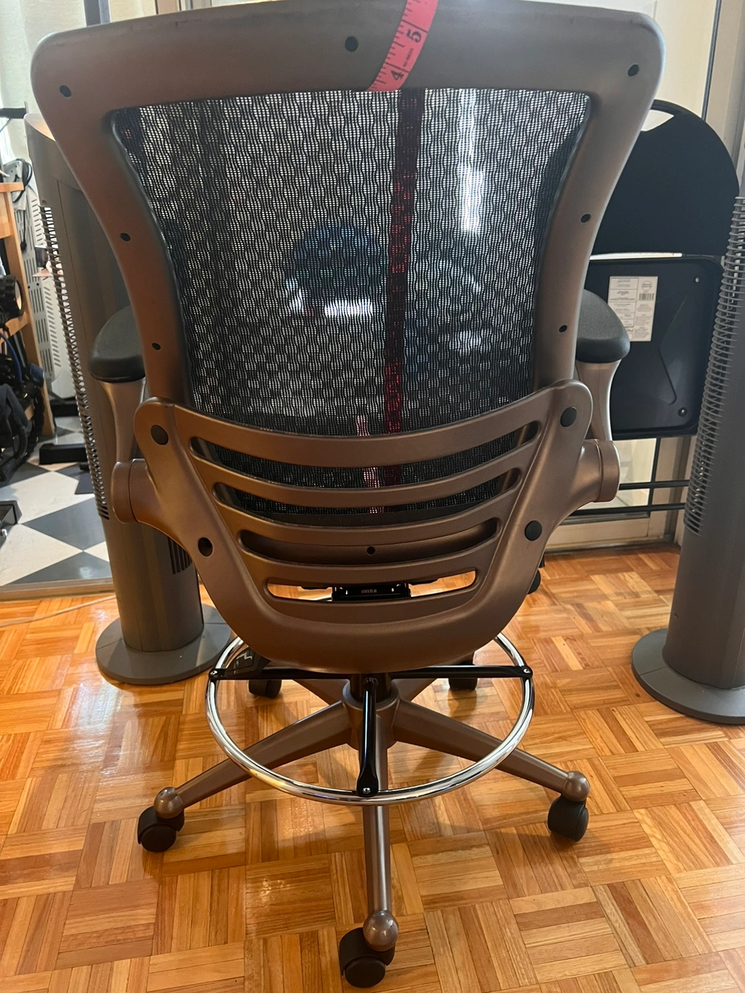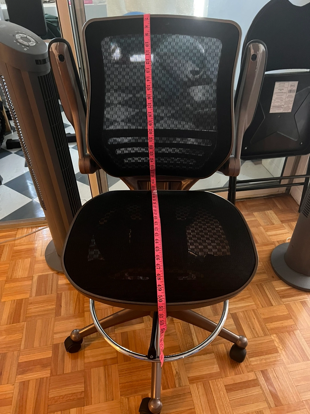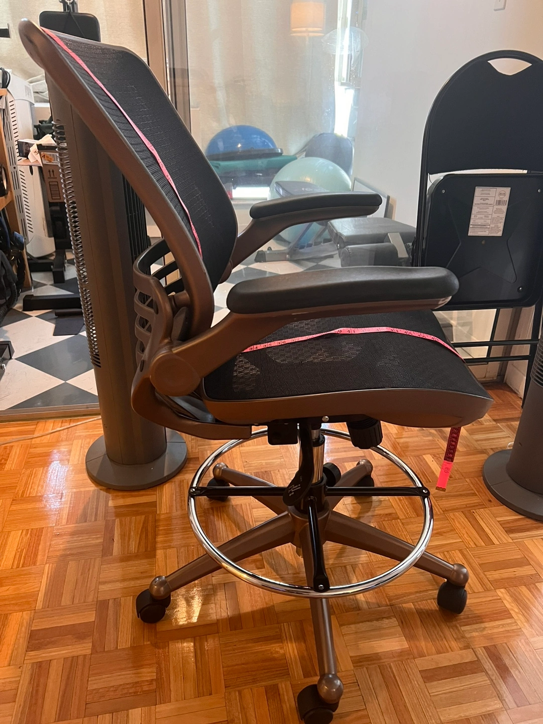 (Tall) Black and bronze ergonomic office chair with adjustable height and recline. It has a mesh fabric back and seat plus adjustable armrests.