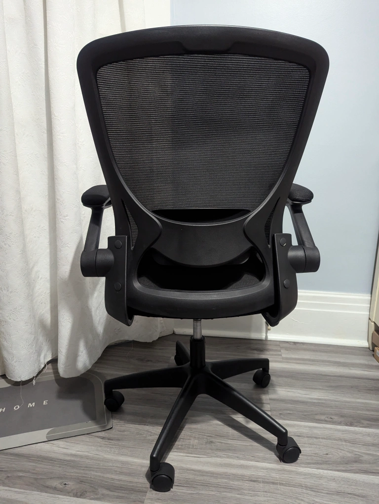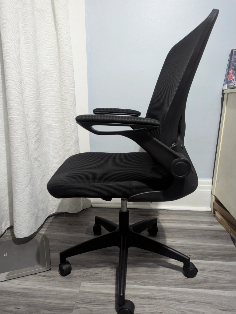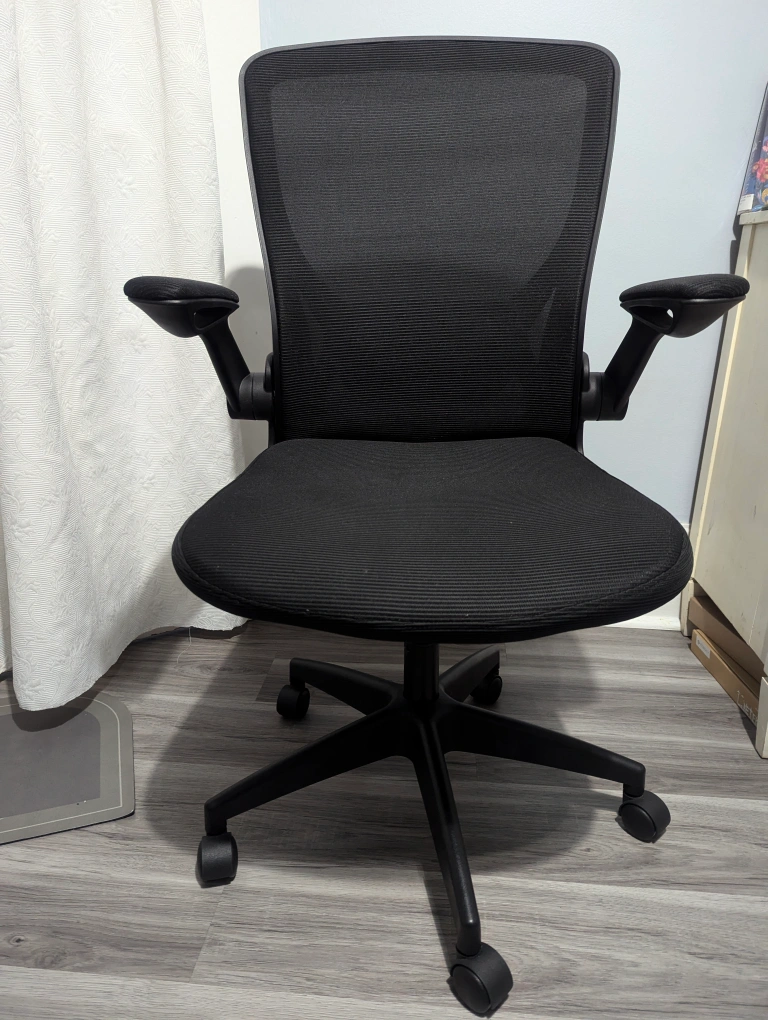 Black mesh office chair with adjustable arms and a swivel base.Very comfortable Ergonomic office chair, adjustable hand rests, Breathable Mesh, Lumbar Support with Wheels and Flip-up Arms, Adjustable Height