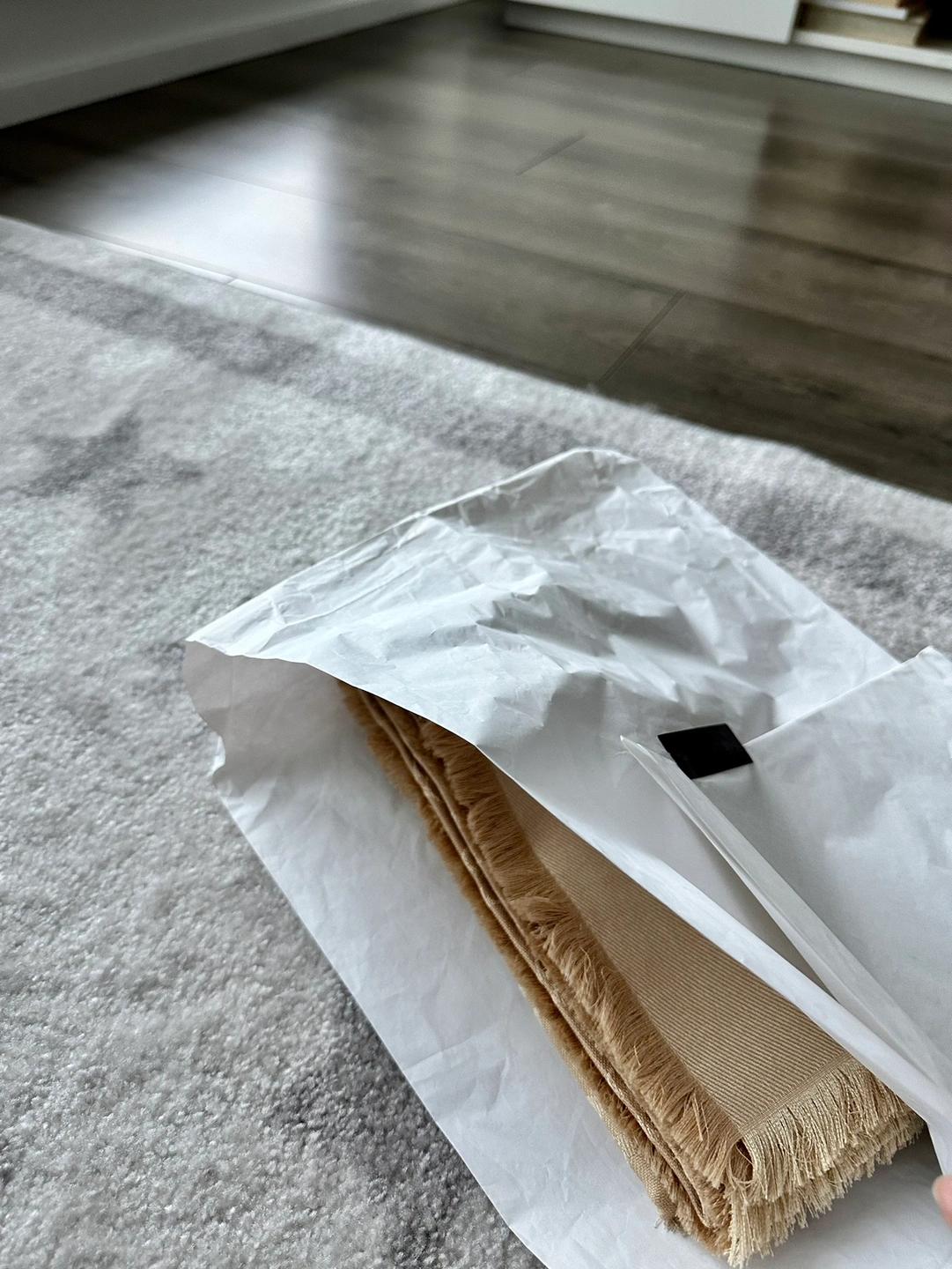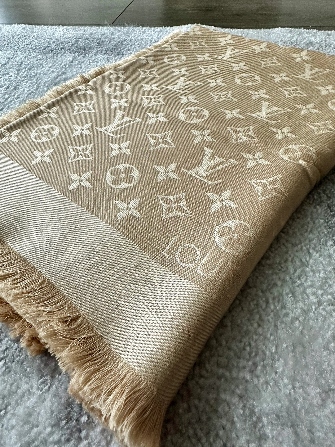 “The Classic Monogram shawl is woven of a soft silk-and-wool blend. Inspired by House travel blankets, it features a jacquard LV pattern and