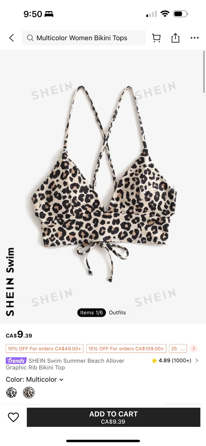 327Leopard print bikini top with criss-cross straps and a tie closure. I didn't get the size right. The item is brand new in a Shein branded bag. Link on Shein: http://api-shein.shein.com/h5/sharejump/appjump?link=VZpgPPSNevP&localcountry=CA&url_from=GM7541033705746890752 Only cash, pick up please at Sheppard Ave W & Bathurst St