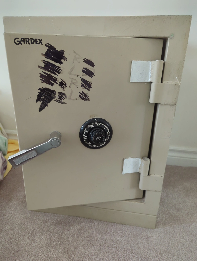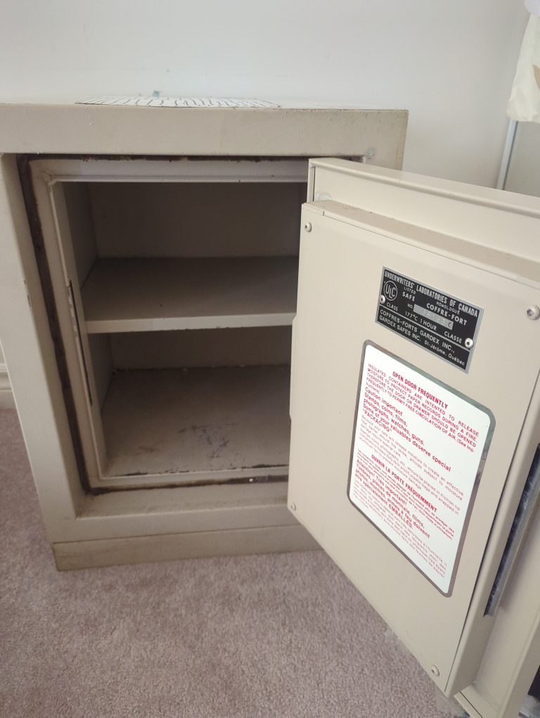 This is a sturdy safe with a combination lock. Class B insurance rating with high-strength steel door and weighs about 168lb. It includes a shelf. Fire-retardant and can be used to store valuables including handguns. There are some minor scratches on the exterior of the safe.