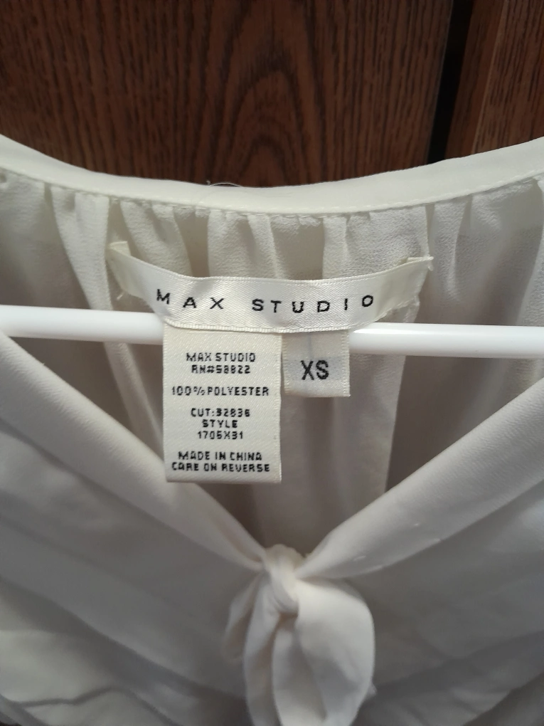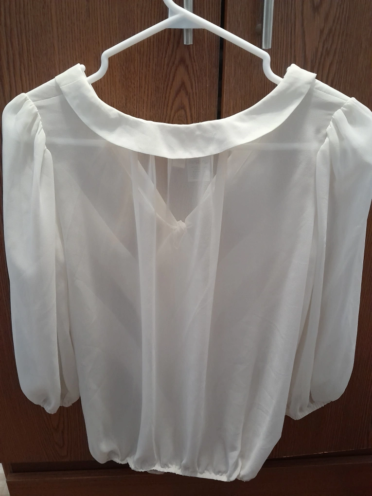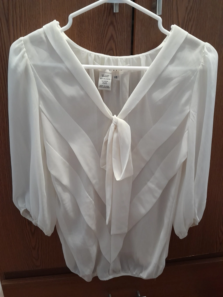 Max Studio white see through 3/4 blouse with a bow tie in the front. It will fit into a size small body type. In good condition.