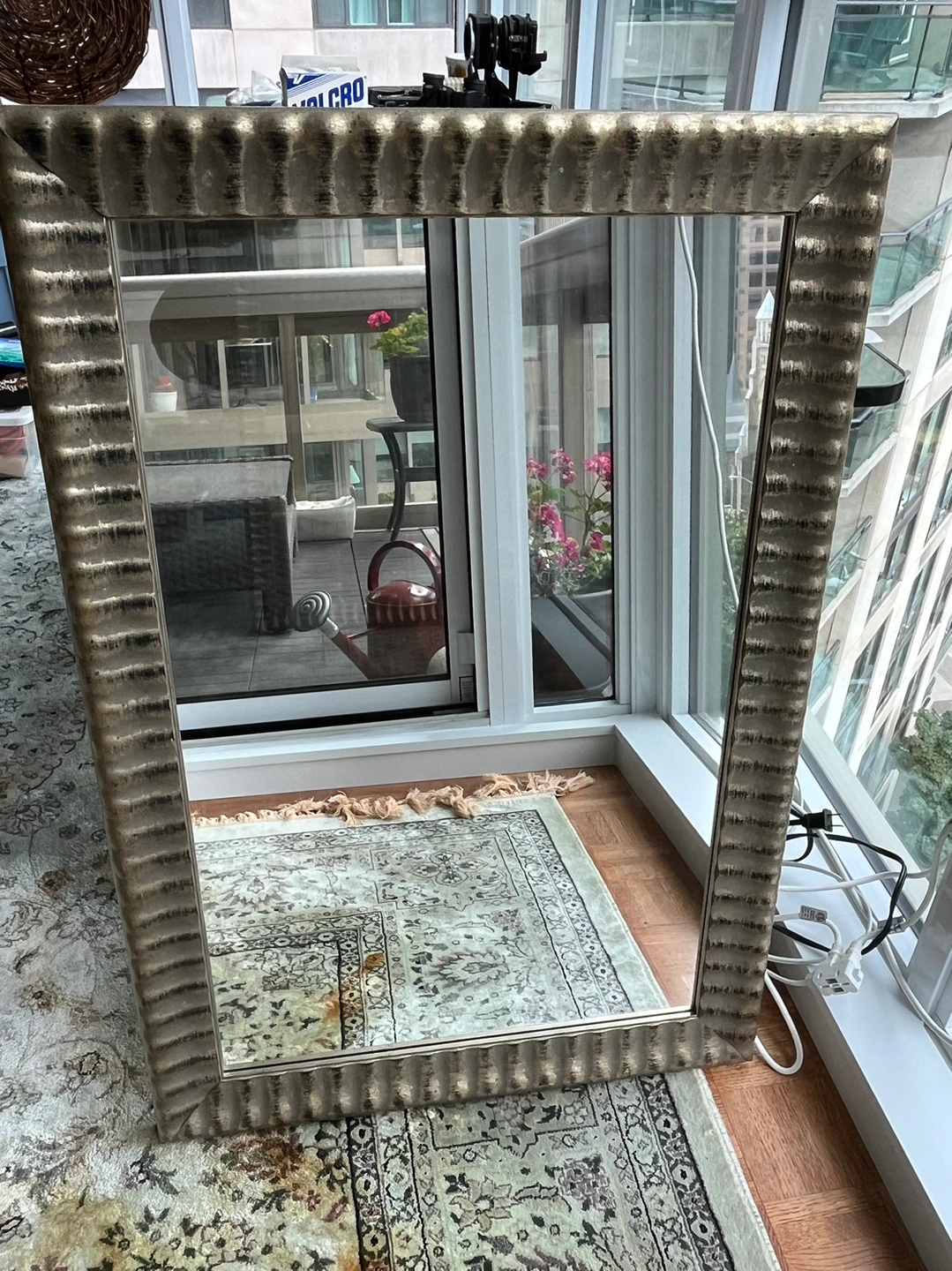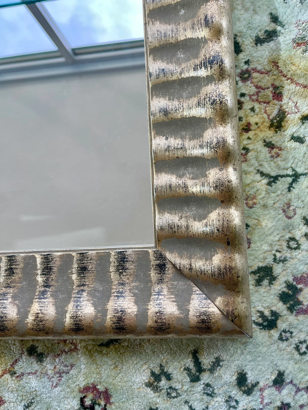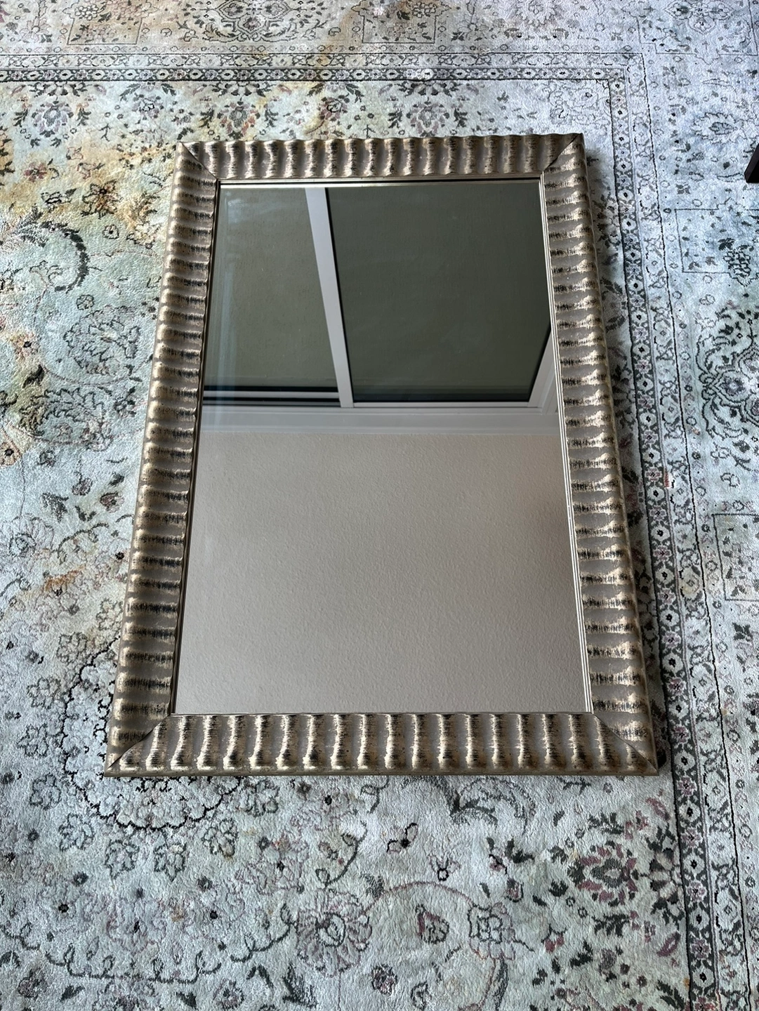 A silver/gold framed mirror with a textured border. Can be hung vertically or horizontally. Measures 25” W x 36.75” L including a 2.75” frame border.