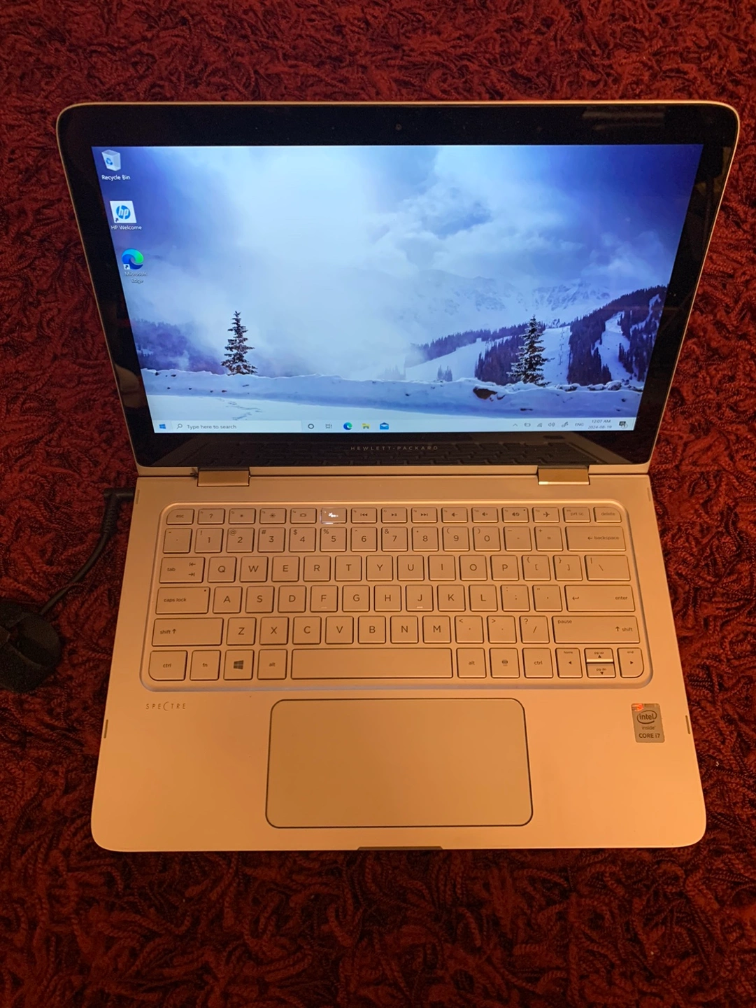 This laptop has an Intel Core i7 processor, 8 GB of RAM, and a 64-bit operating system. It has a touch screen with 10 touch points. It comes with Windows 10 Home.
