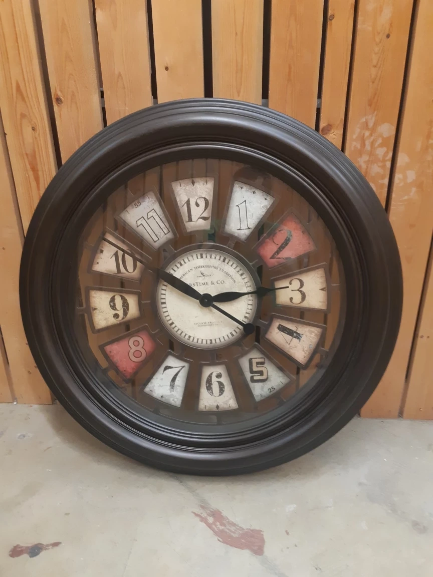 Large decorative wall clock with a dark brown frame. Features Roman numerals around the clock face. The clock face is comprised of various squares that have the numbers 1-12 on them. The clock has a black hands for the hour, minutes, and second. The clock requires 1 AA battery (not included). The clock is in good condition. The clock measures 36 inches in diameter.