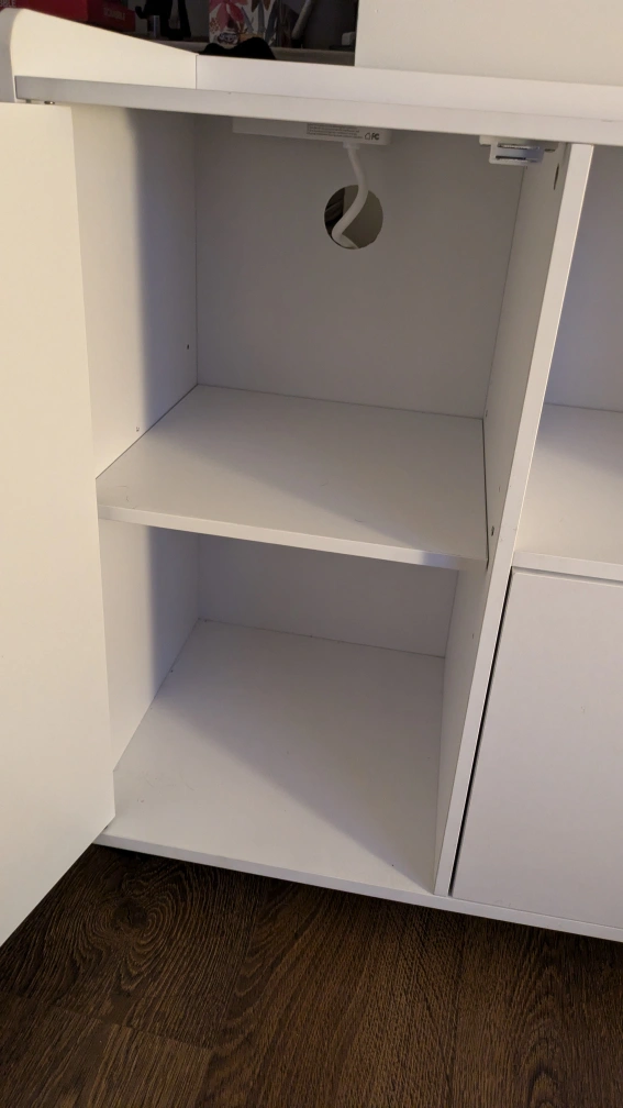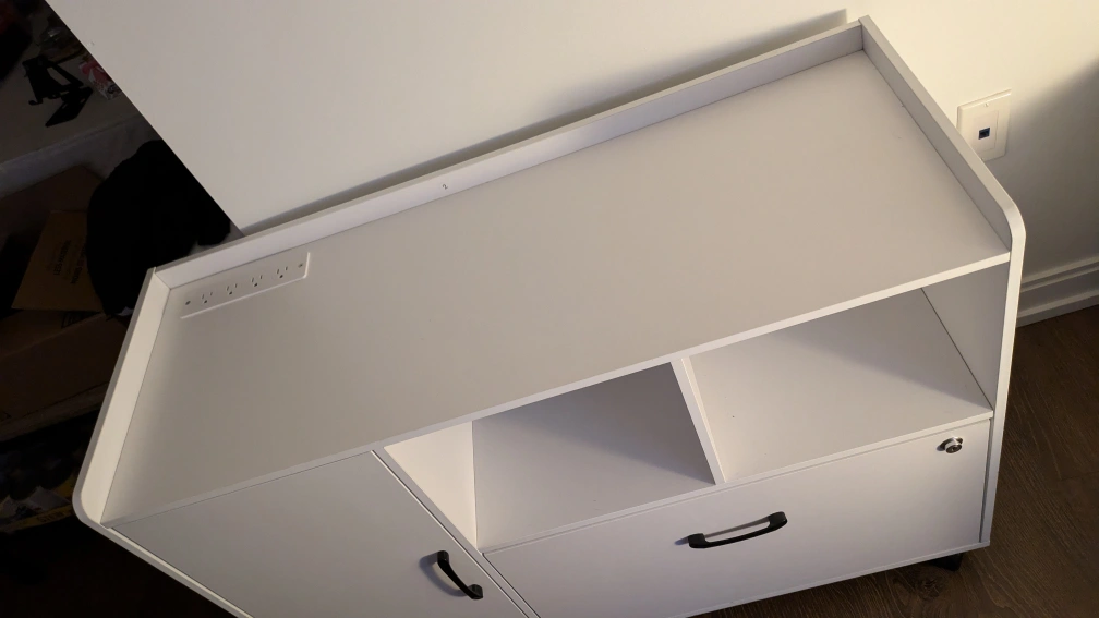 Purchased last year July 18, 2023. Really beautiful, heavy and sturdy quality. Has lockable wheels for ease of transportation. Four outlets on connecting printer, hubs, chargers or other electronics.