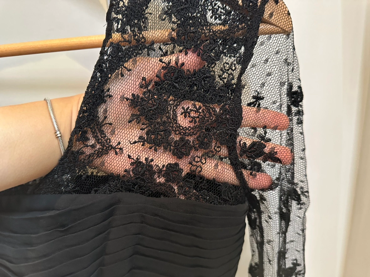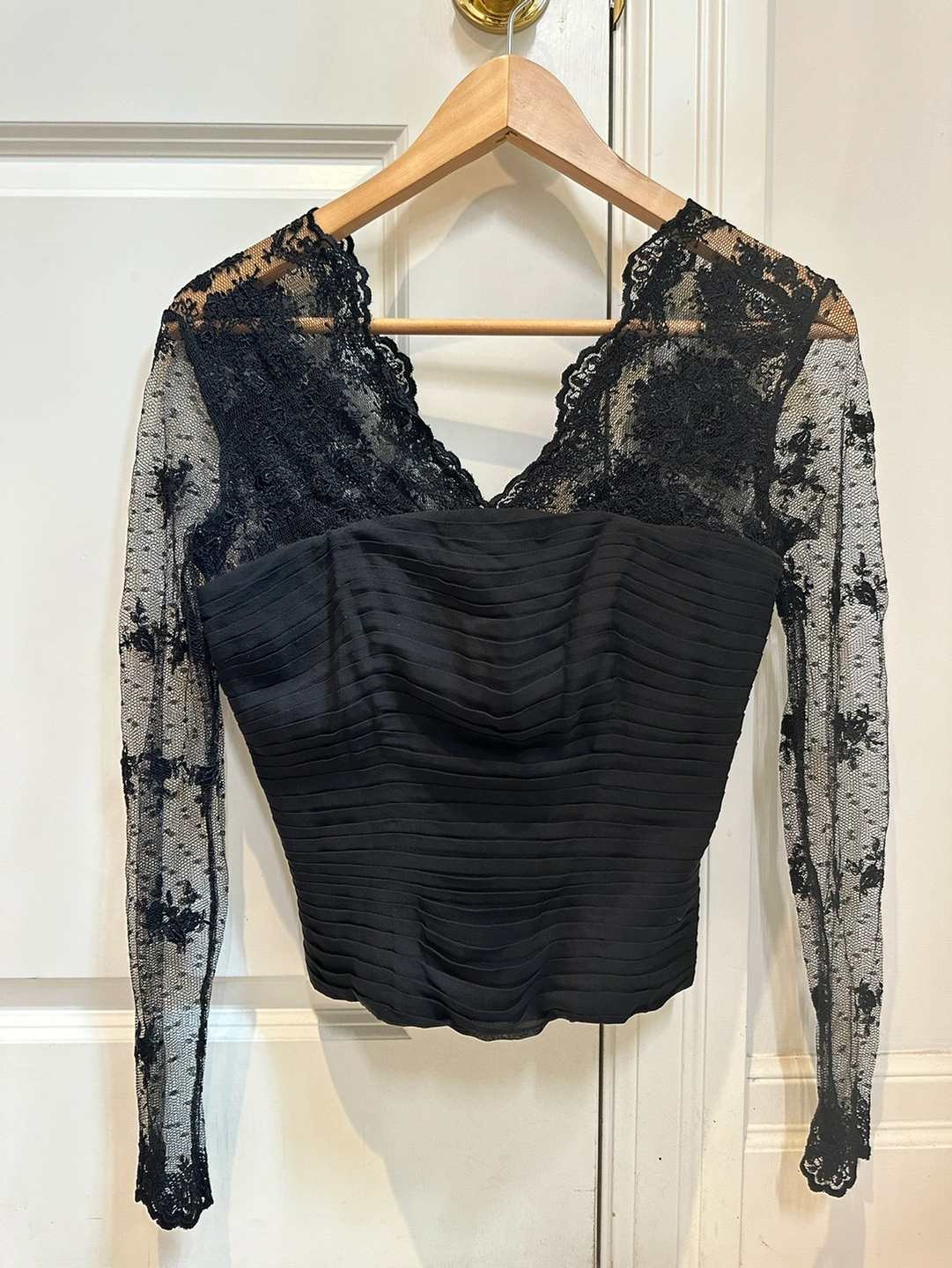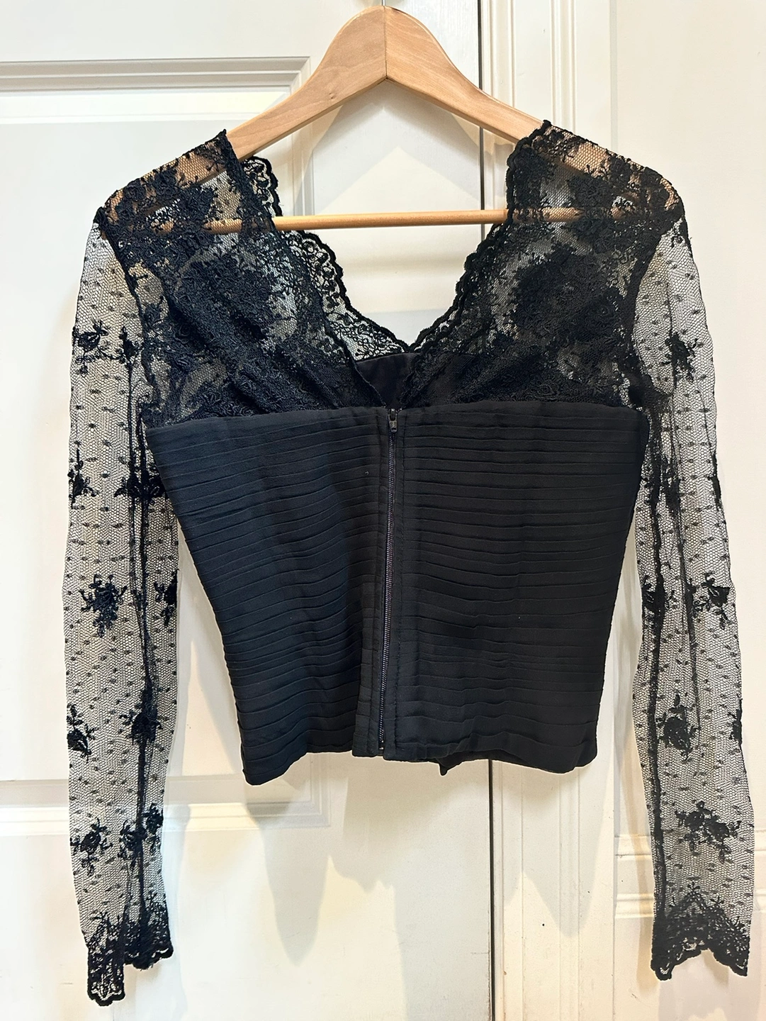 A beautiful black corset top with lace sleeves and a sweetheart neckline. The top is form-fitting and super flattering! Only worn once, it no longer fits me! :(