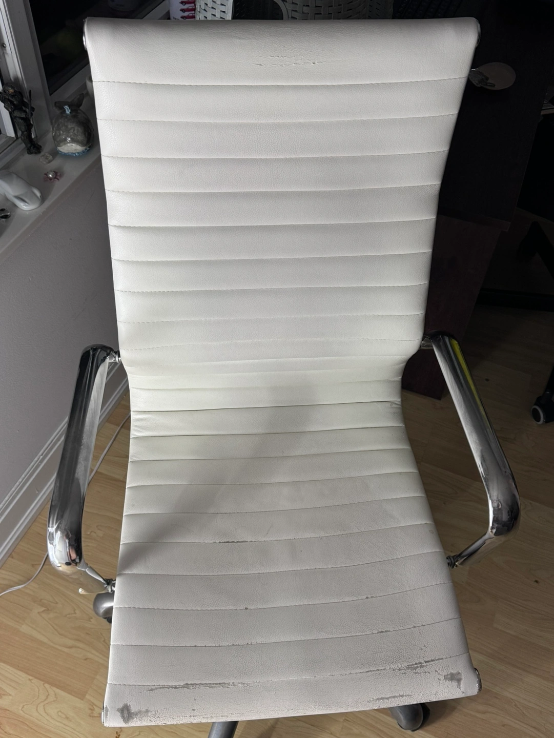 Comfortable office chair with chrome arms and base. The chair has wheels and adjustable height. It is in good condition but has some wear and tear on the fabric. Please see pictures for details.