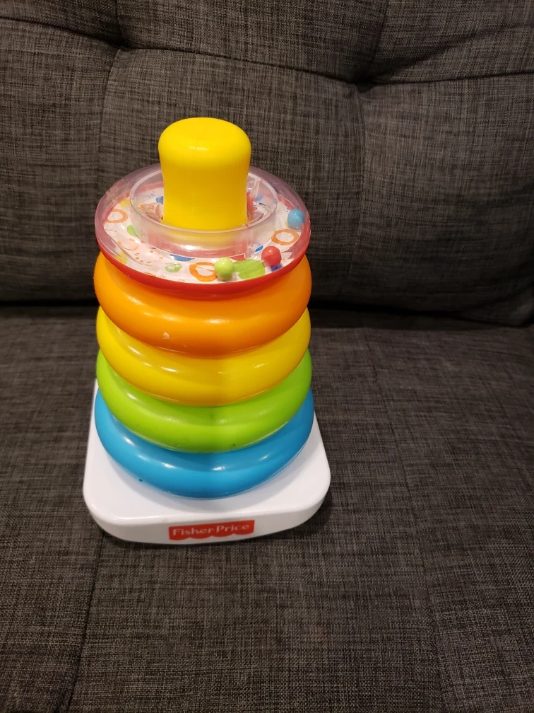 This is a bright and colourful stacking ring toy for babies and toddlers. It includes a base and five rings that can be stacked in any order.