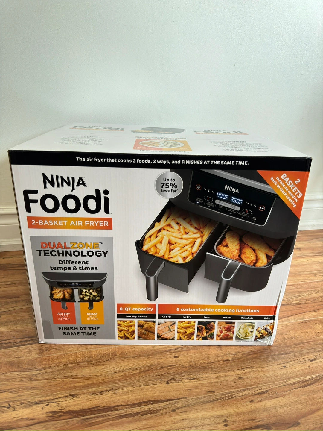 This is a Ninja Foodi 2-Basket Air Fryer with DualZone technology. It has a large 8-quart capacity with 6 customizable cooking functions. The fryer also features an air-fry, roast, bake, reheat, dehydrate, and a keep warm function.