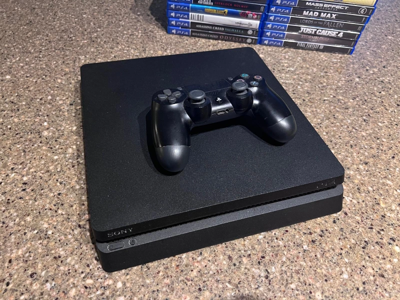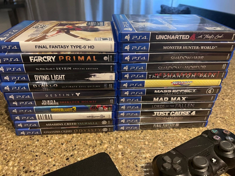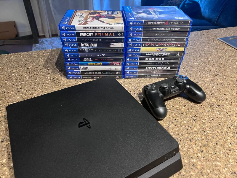 751PlayStation 4 (PS4 Slim) with 20 Games and 1 Sony Controller. Comes with HDMI and AC Power Cables. - Assassin's Creed Odyssey - Assassin's Creed Valhalla - Batman (Sold) - Borderlands 3 - Crime and Punishment Sherlock Holmes - Destiny - Diablo III - Dying Light - Elder Scrolls Skyrim - Farcry Primal - Final Fantasy Type-0 HD - Final Fantasy XIV - Final Fantasy XIV Stormblood - Just Cause 4 - Lords of the Fallen - Mad Max - Mass Effect Andromeda - Megaman Legacy Collection - Metal Gear Solid V the Phantom Pain - Middle Earth Shadow of War (Sold) - Middle Earth Shadow of Mordor (Sold) - Monster Hunter World - Unchartered 4 A Thief's End