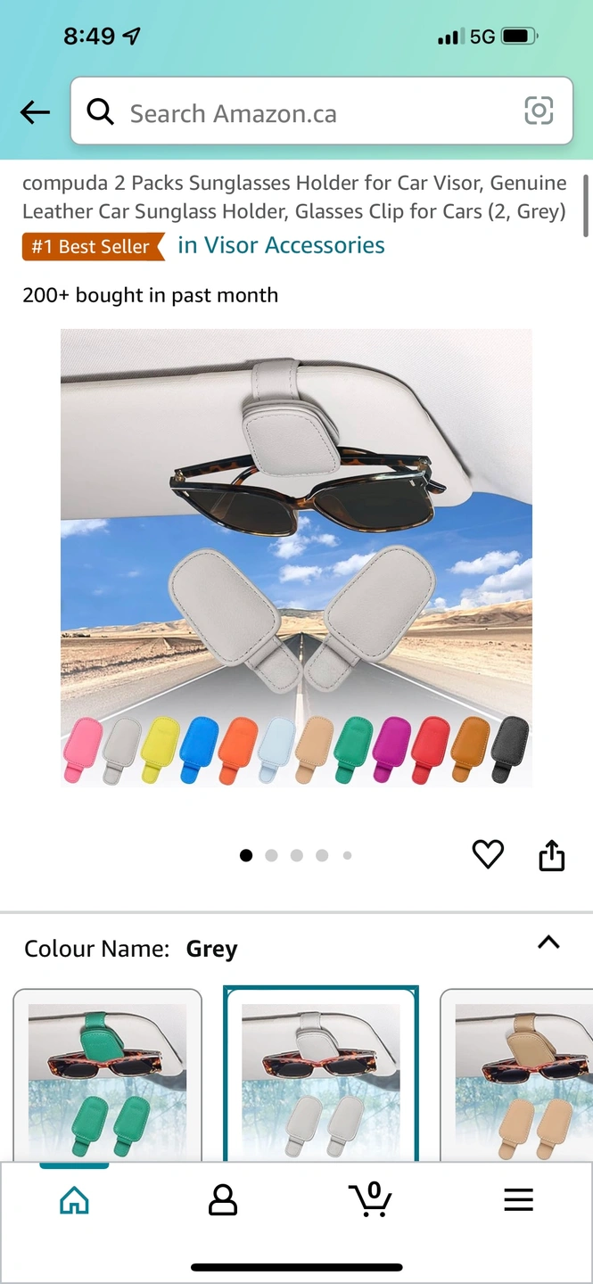 A pair of leather sunglasses holders for car visors. The sunglasses holders clip to the visor to hold your sunglasses.
