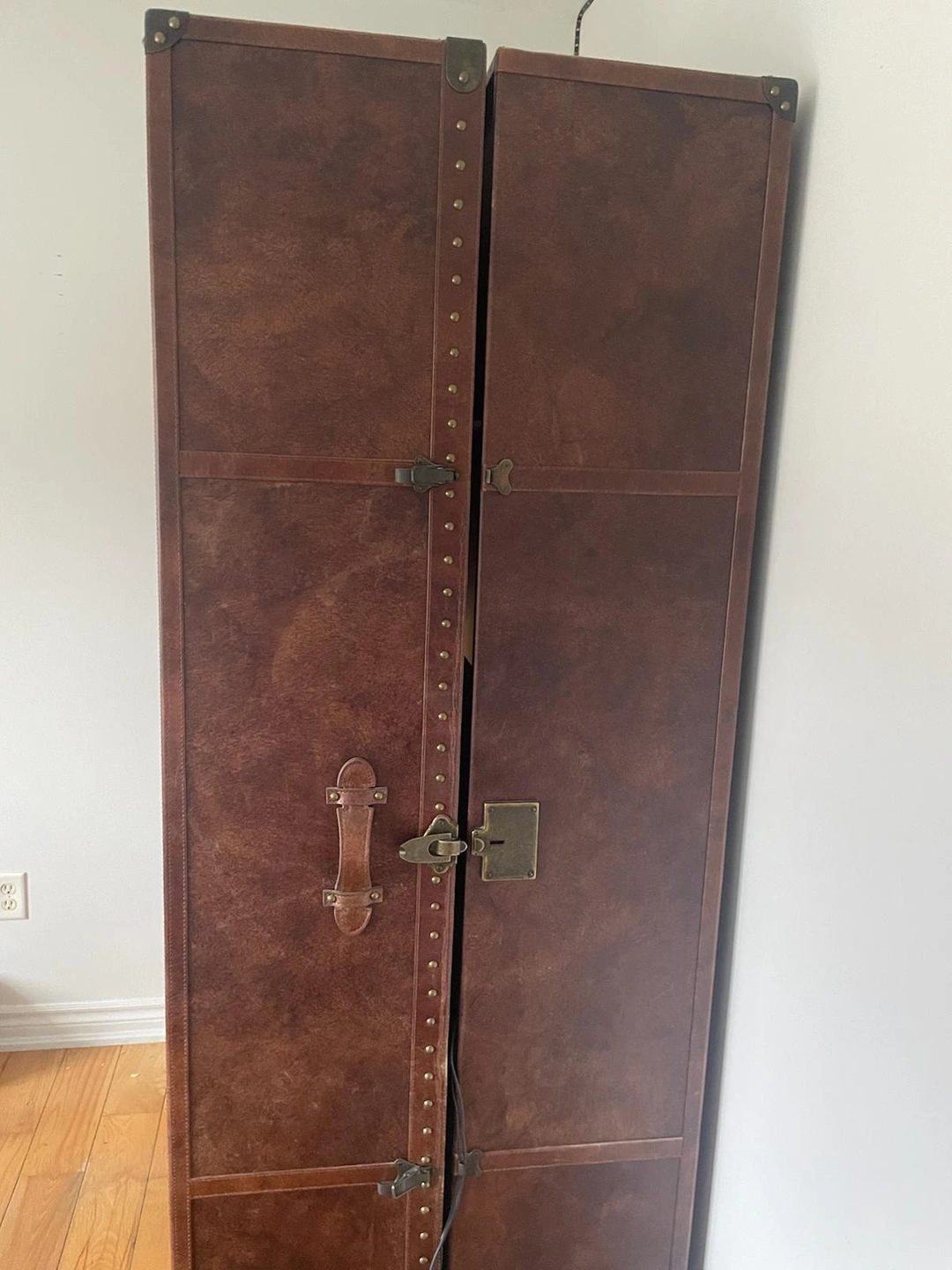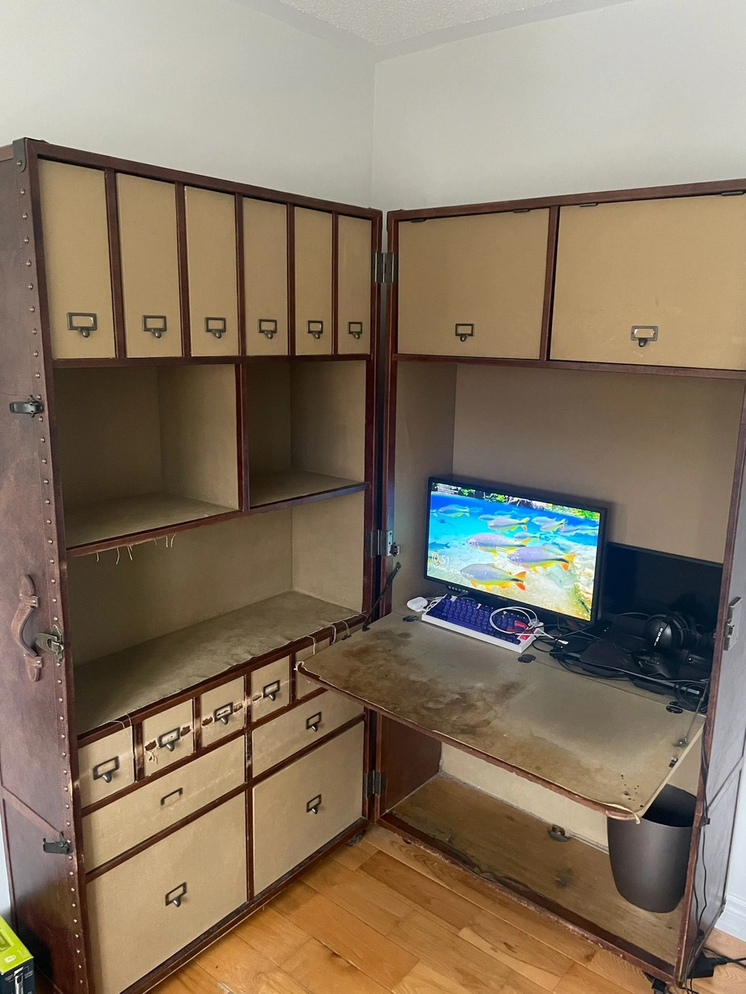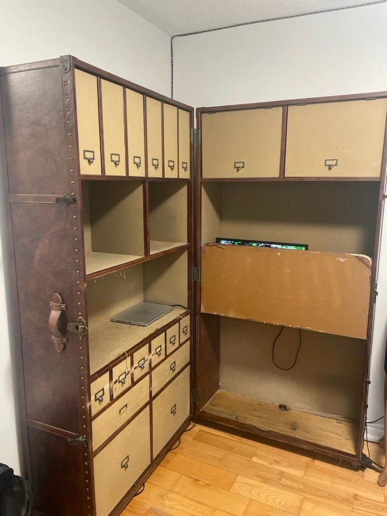 19A large vintage travel trunk that converts into a desk. Origin | California, USA Materials | leather, fabric, wood & metal Era | 2000s Height | 140 cm Width | 80 cm Depth | 240 cm Weight | 95 lbs The fabric has been stained or torn in some areas but can definitely be restored. Overall, the rest is in good shape and is very useful with lots of storage.