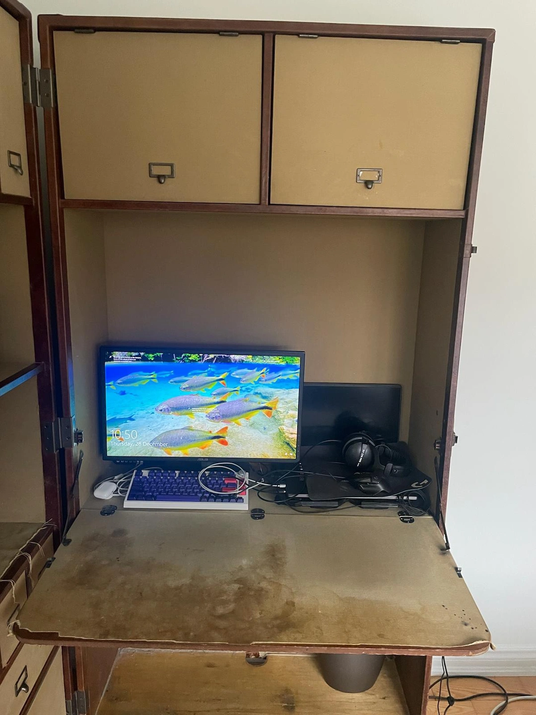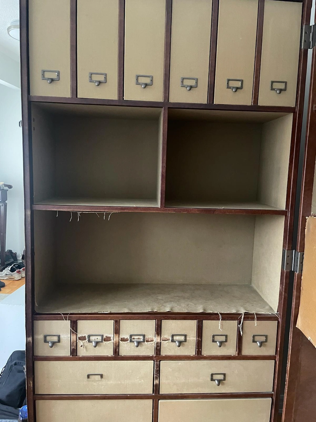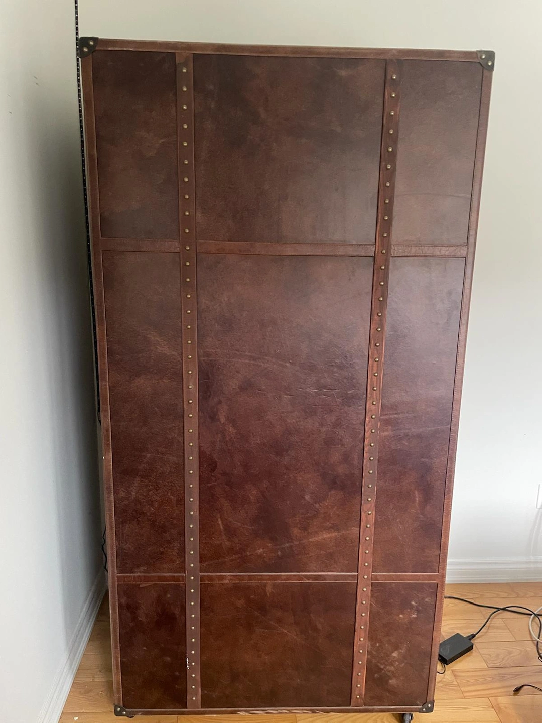 19A large vintage travel trunk that converts into a desk. Origin | California, USA Materials | leather, fabric, wood & metal Era | 2000s Height | 140 cm Width | 80 cm Depth | 240 cm Weight | 95 lbs The fabric has been stained or torn in some areas but can definitely be restored. Overall, the rest is in good shape and is very useful with lots of storage.