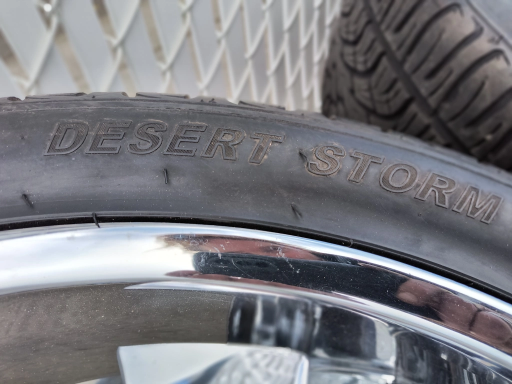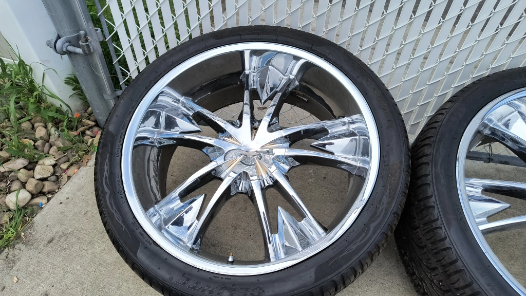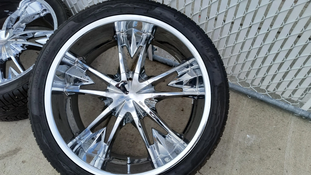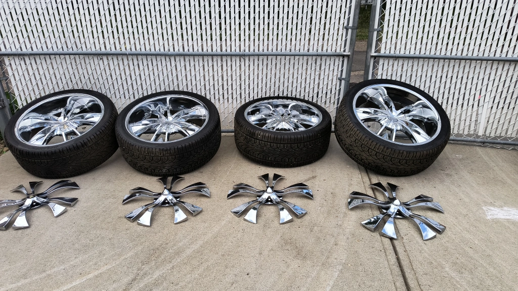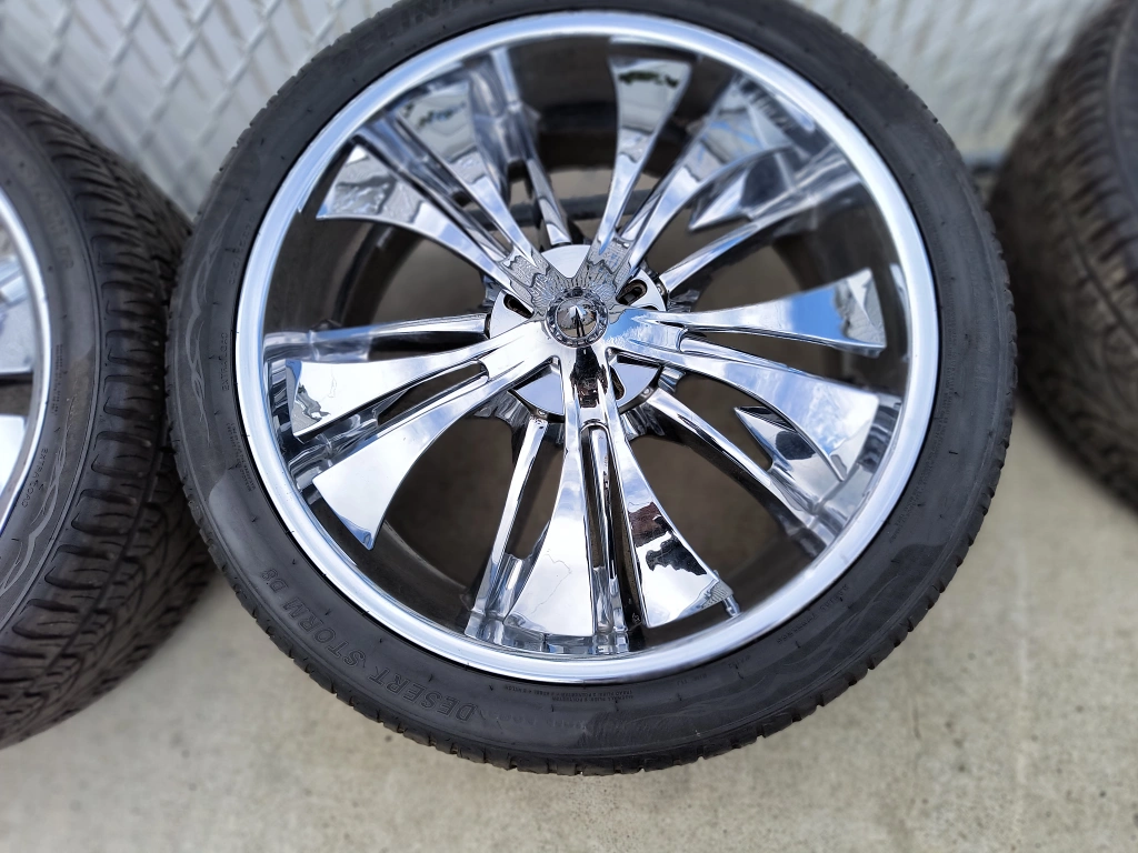 Set of 4 24" Ultra chrome rims with desert Storm low profile tires. Includes centre caps.spinners and mounting lugs.6x139mm lug pattern,12" wide,gorgeous rims.willing to trade for safetied winter beater.