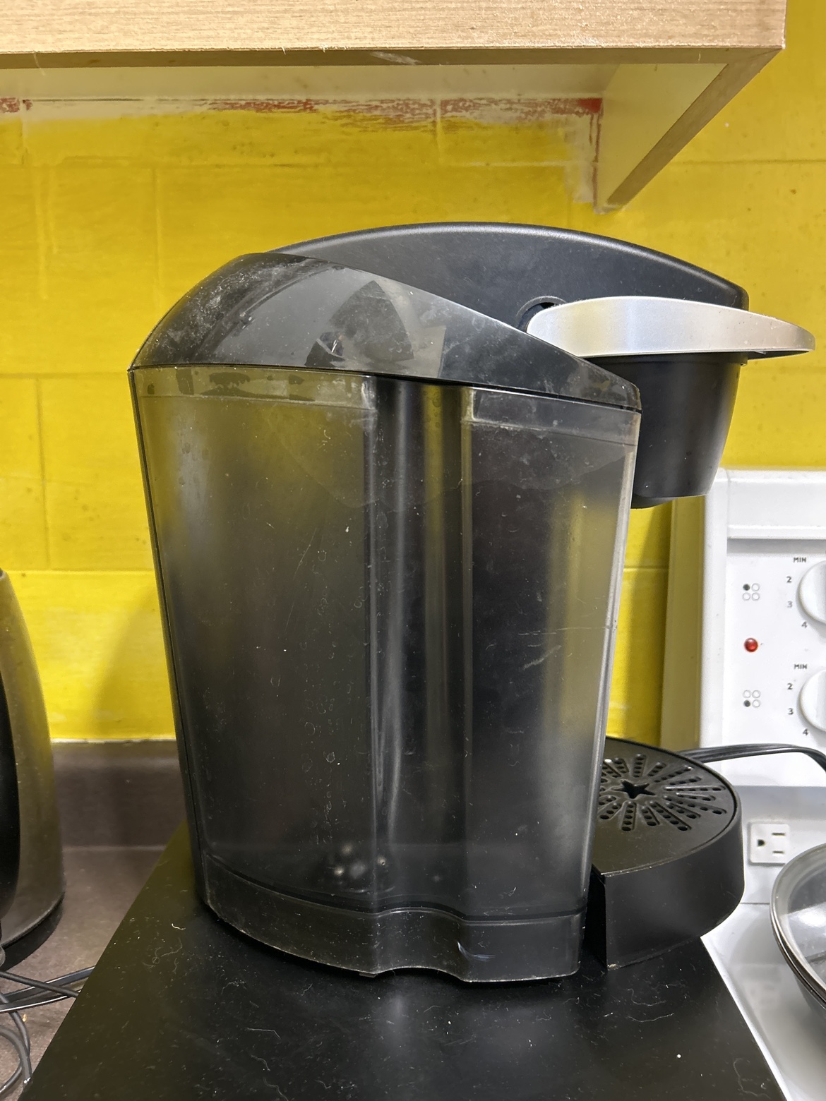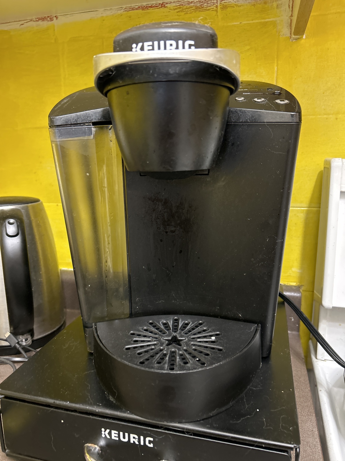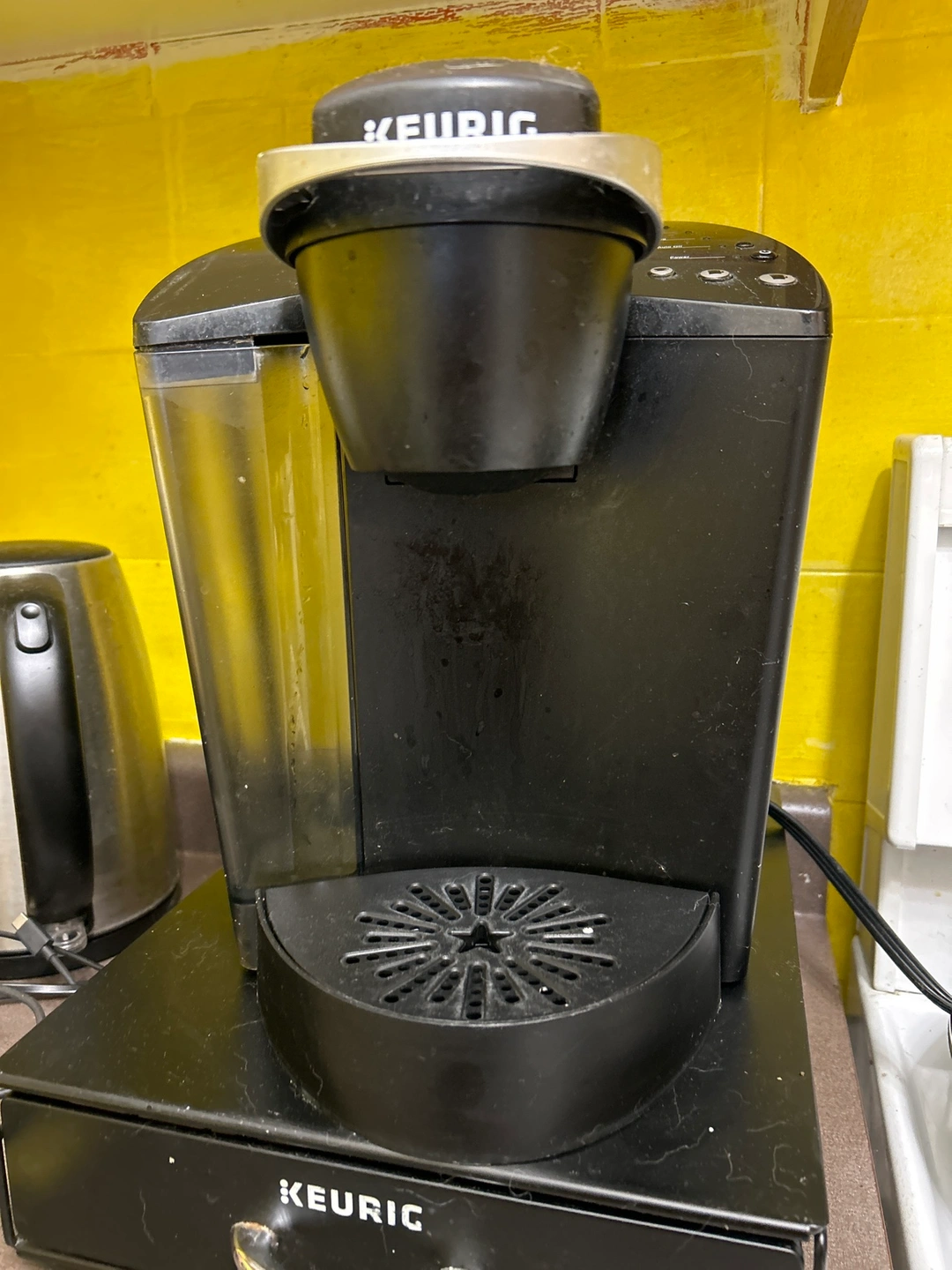 Single serve coffee maker. Includes a removable water reservoir. Comes with a K-Cup holder and a drip tray. Good for making a quick cup of coffee.