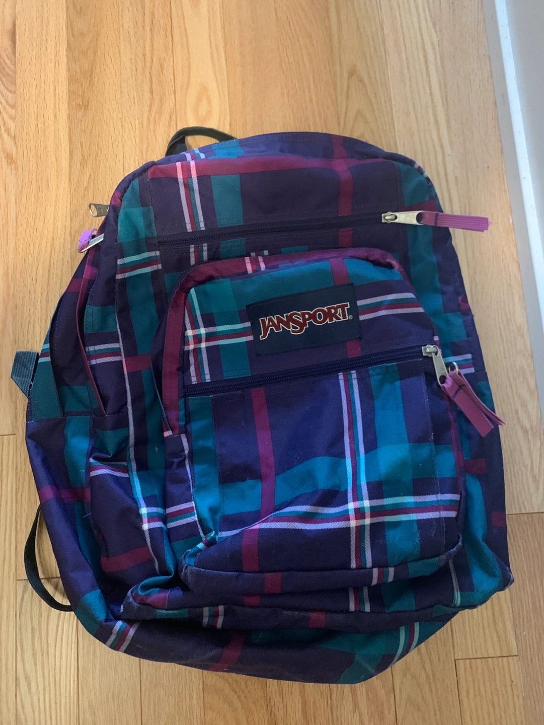 A classic JanSport backpack with a plaid pattern. It has two large main compartment, three front pocket, and one side pockets for your water bottle. It also features adjustable straps and a padded back.