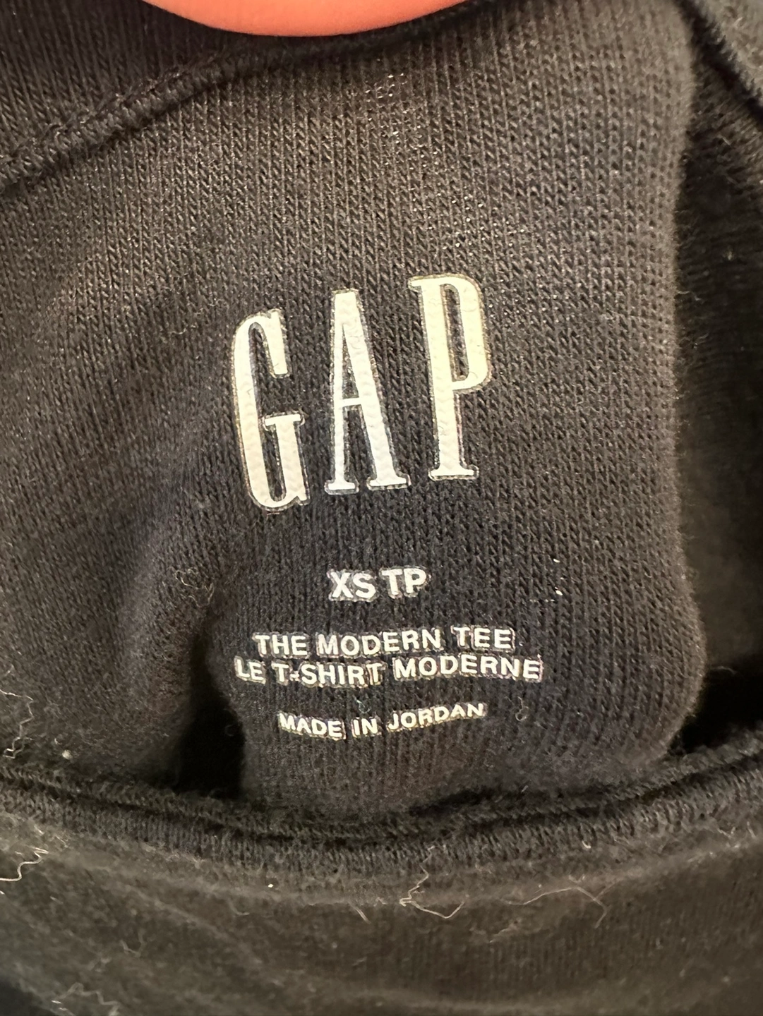 Two shirts, one black and one navy. 3/4 sleeves with a boat neck, scoop back, size XS. Made by Gap. The tops are made of a soft, comfortable material.