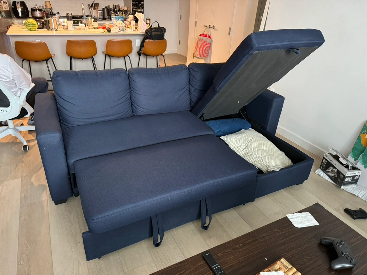 Three year old L shaped couch that can be assembled in either direction, pulls out to at least a double sized bed that I have slept on with great comfort, the chaise (the side that opens) features hidden storage. It also came with two toss pillows that you can have if you’d like!