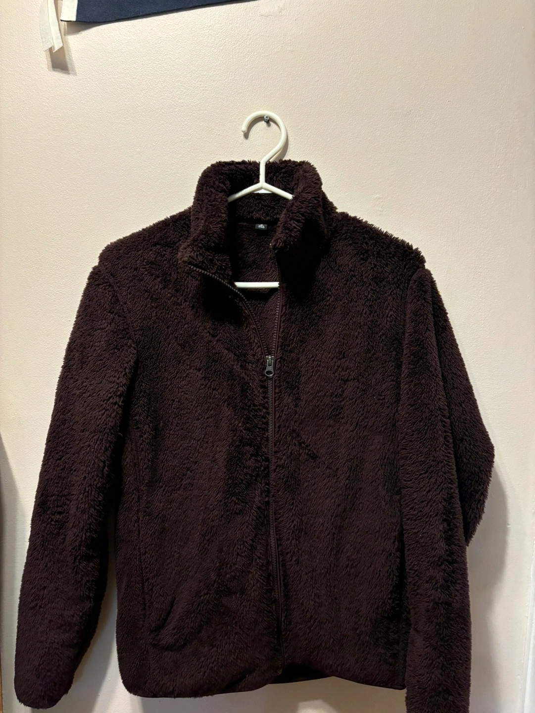 A brown fuzzy jacket with a zipper. It has a stand up collar and long sleeves. It is made of a soft, plush material.