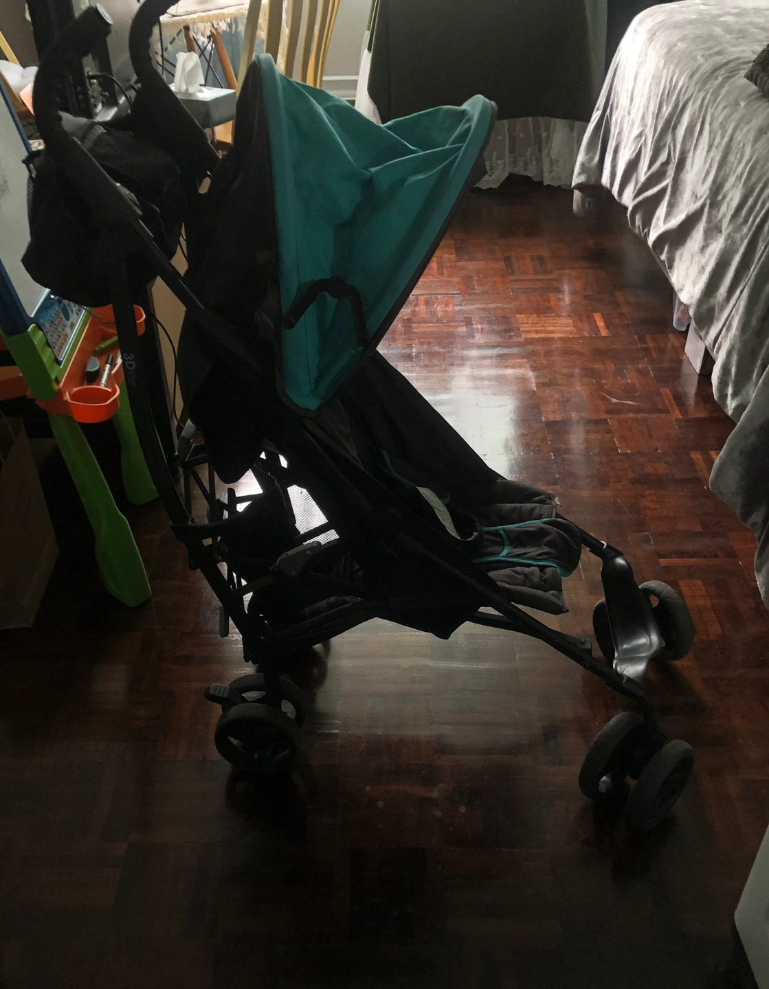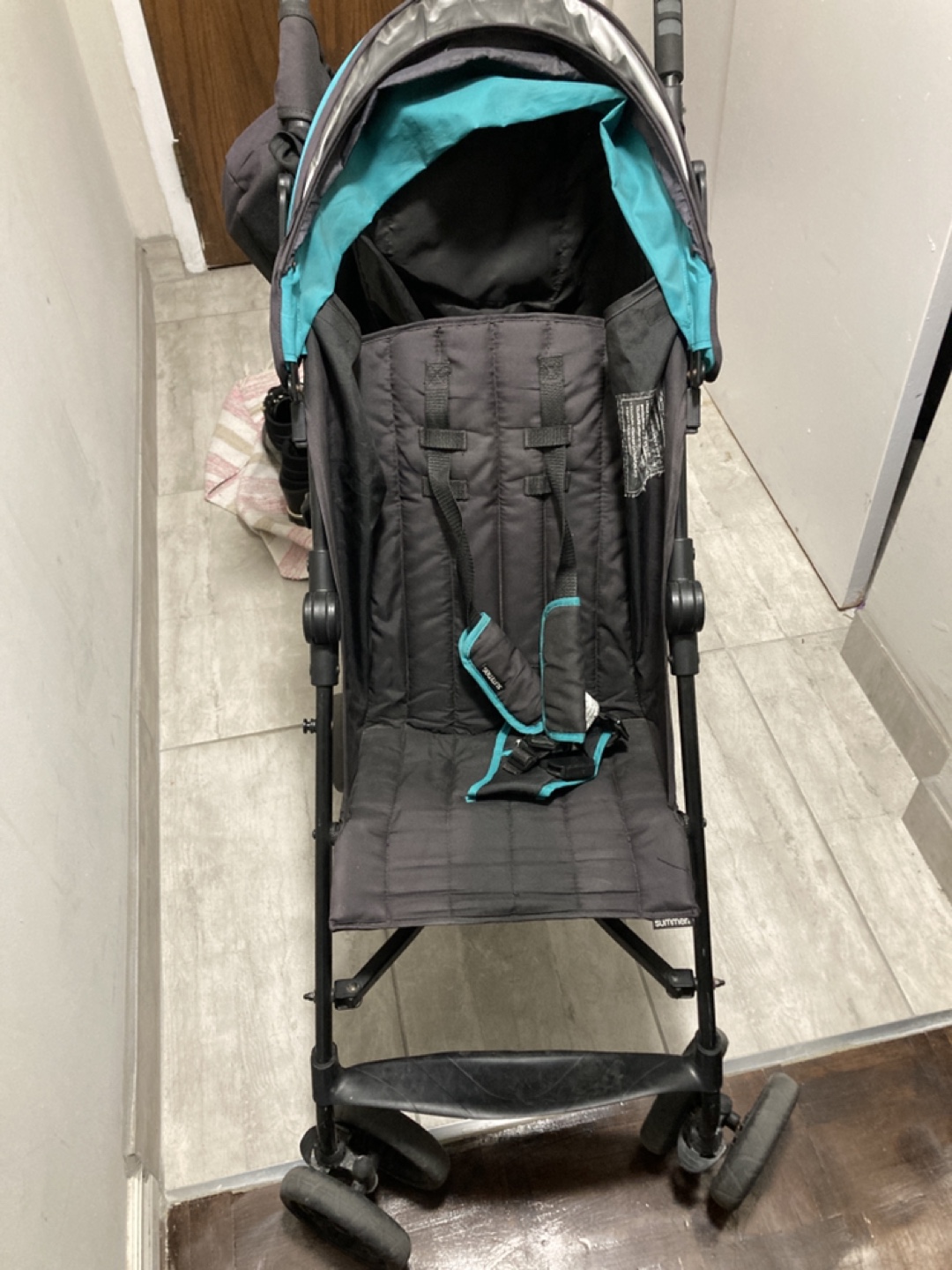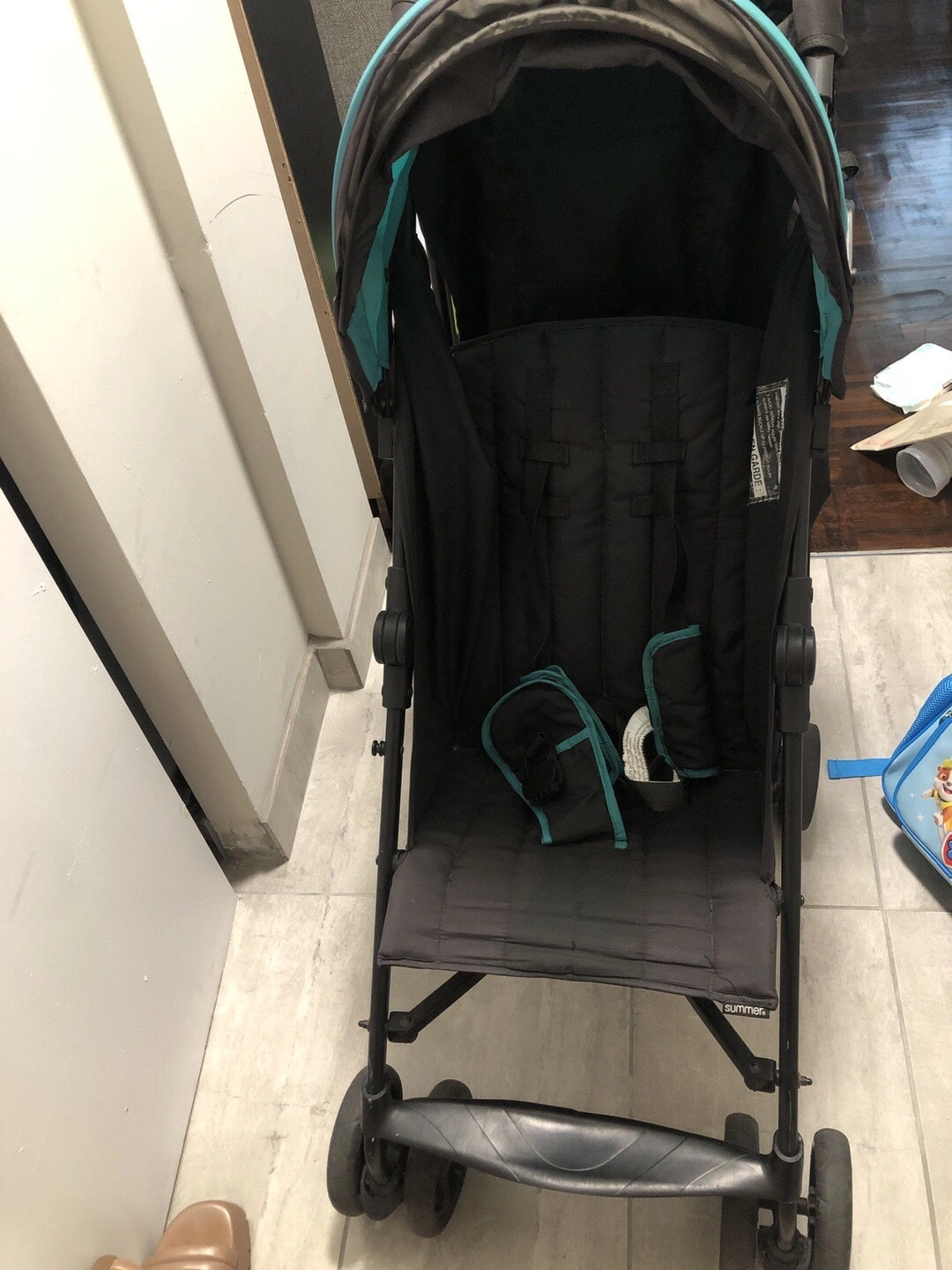 Lightweight and compact stroller with a teal canopy. It has a carry strap and folds easily for storage. Used but in excellent condition !