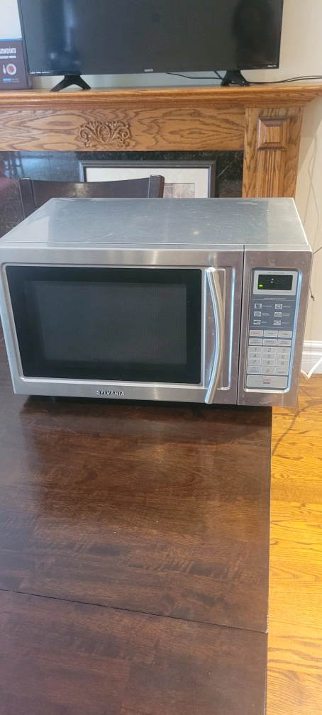 Stainless steel microwave with a digital display and a number pad. It has a variety of settings for different foods. it's working perfectly. Includes turntable.