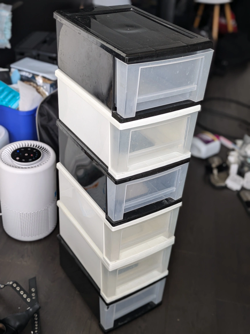 Set of six stackable storage drawers. Two are black with clear drawers and two are white with clear drawers.