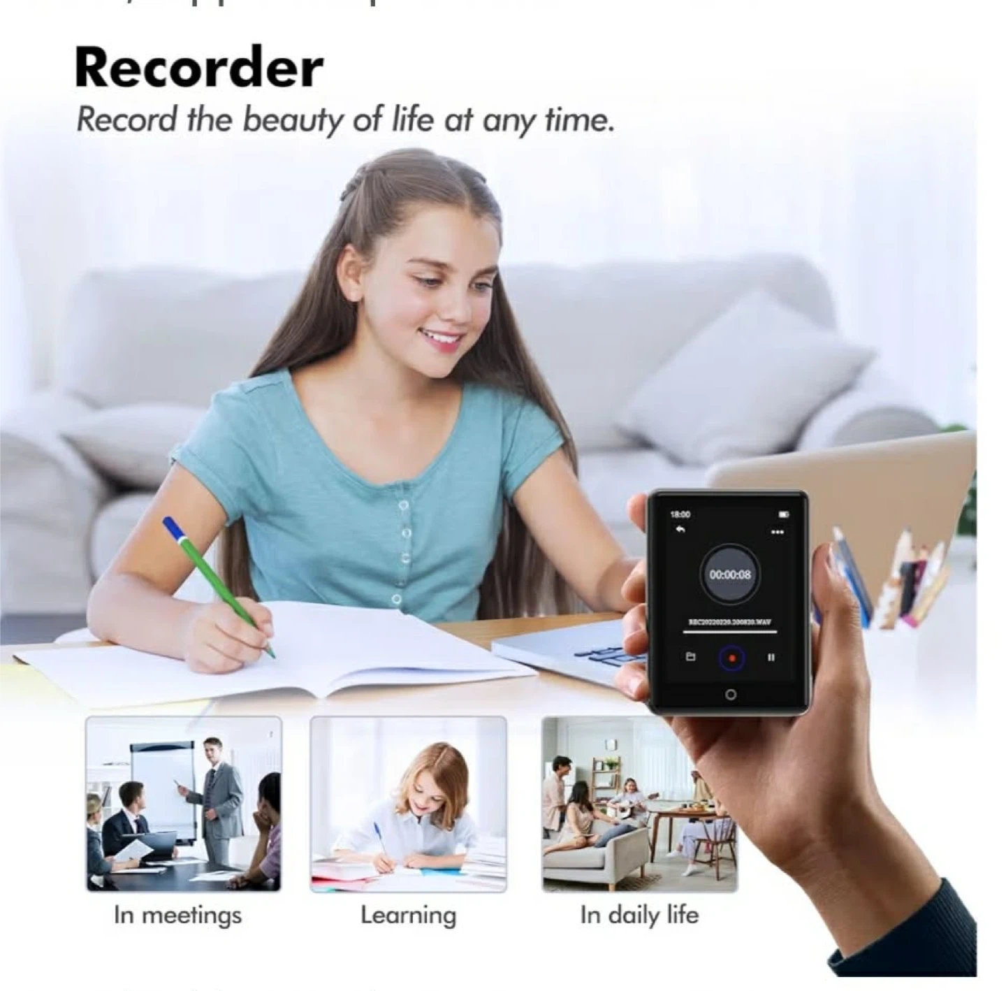 This MP3 player has 64GB built-in storage and supports up to a 128GB memory card. It offers 40 hours of playback and includes music, video, e-book, FM radio, recorder, and pedometer functions. It's great for exercise, learning, or daily use!