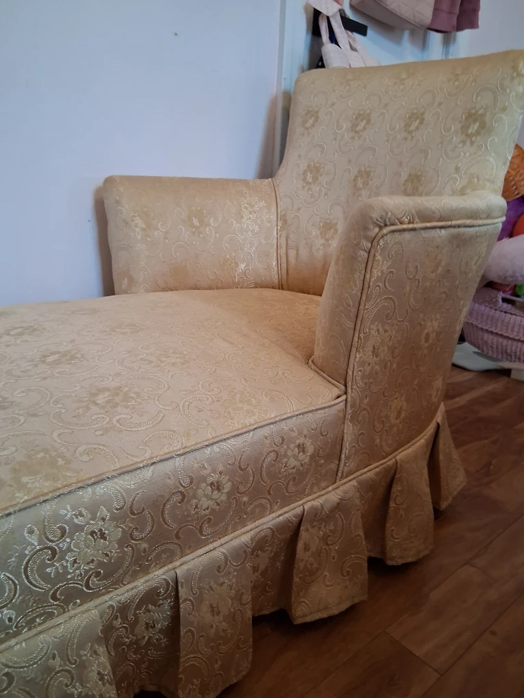Selling a vintage chaise lounge chair. It has a cream-coloured floral pattern and a unique design. Perfect for adding a touch of elegance to any room!