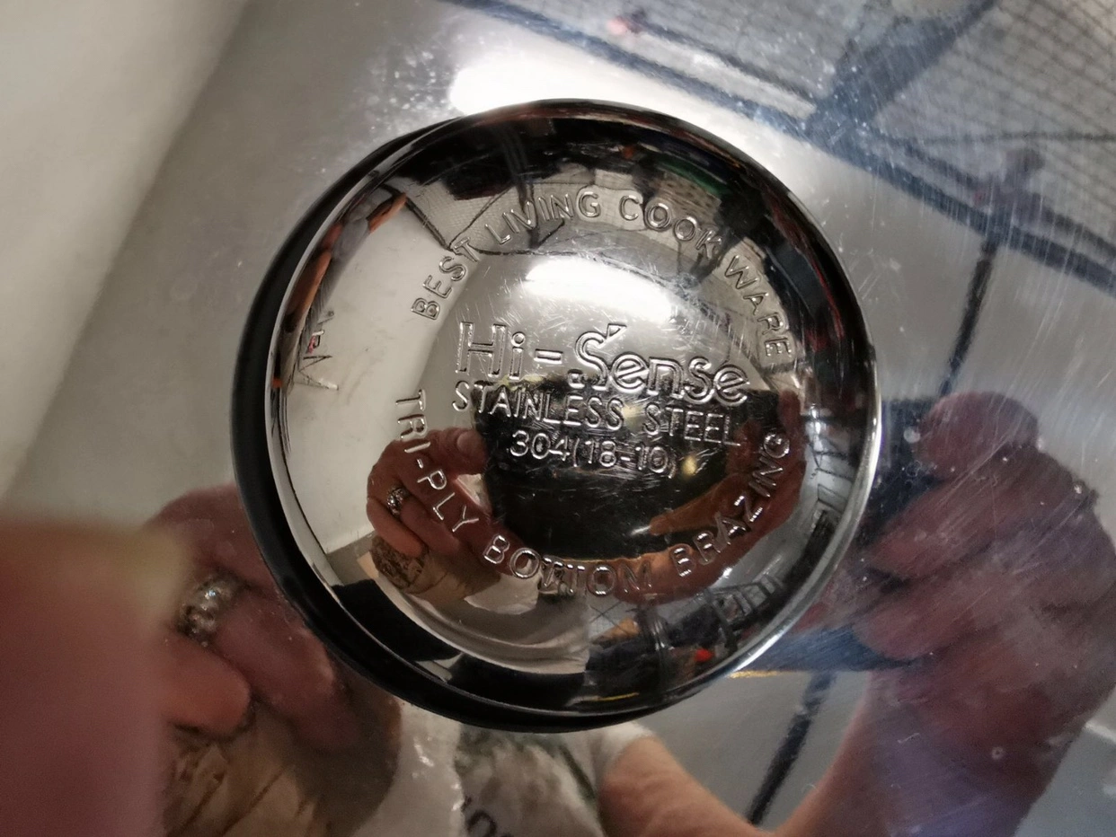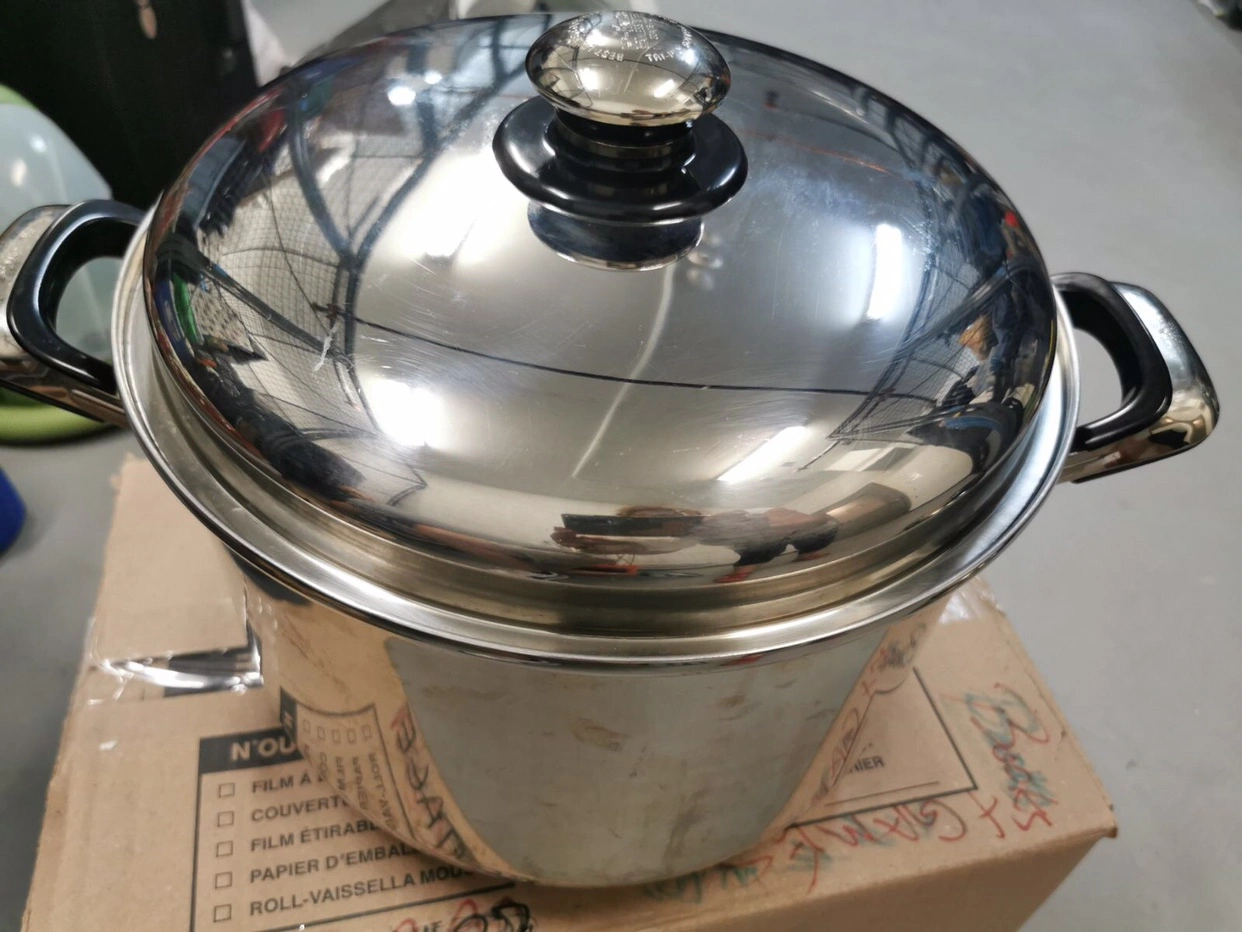 69Large stainless steel pot with lid and black handles. Best Living Cookware Hi Sense La Casa Made in Italy