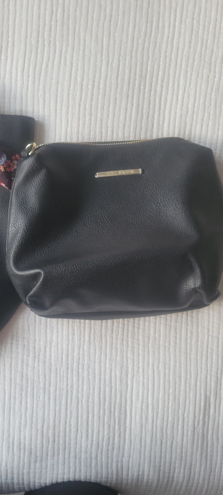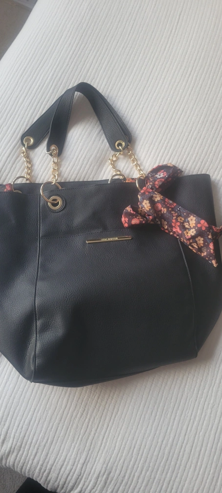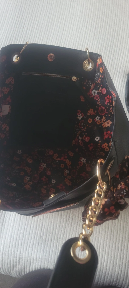 Black tote bag with gold chain accents and floral lining. Includes a matching smaller bag. Excellent for everyday use. Purchased for my mom but it's not what she was looking for.