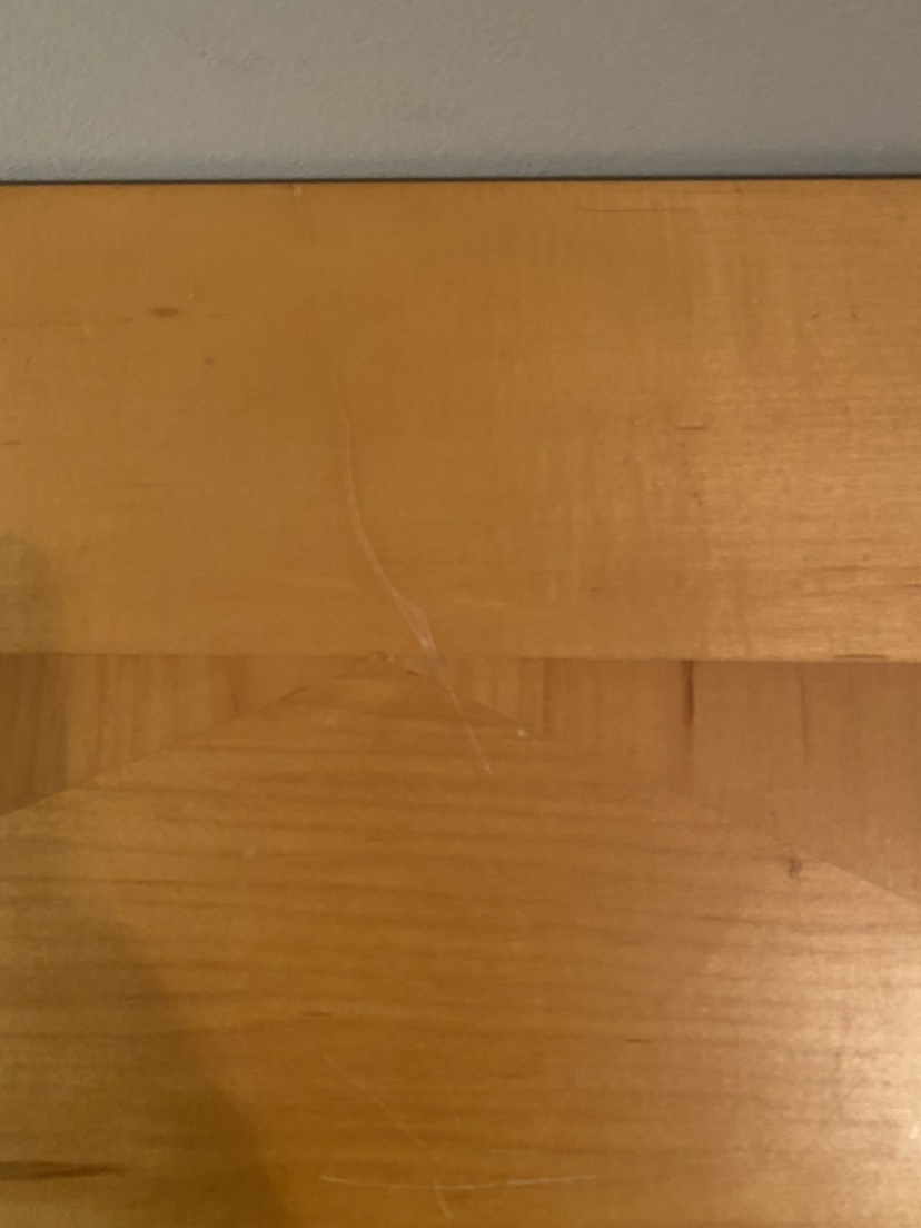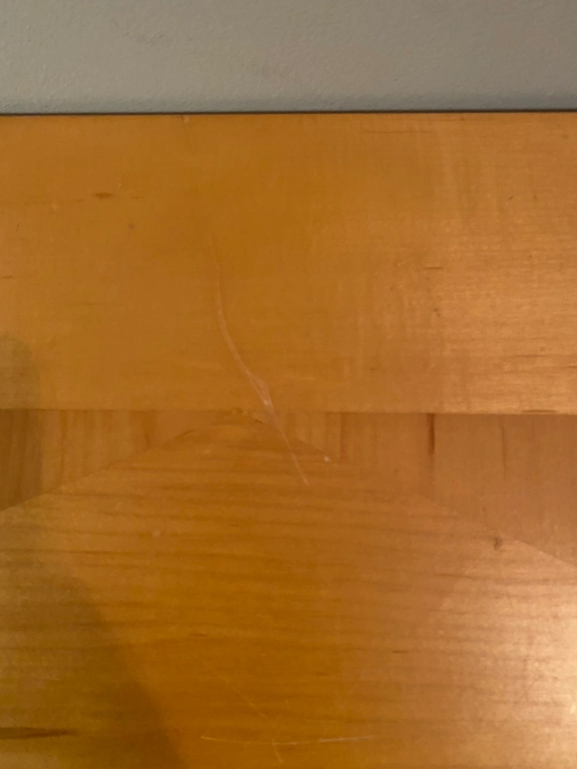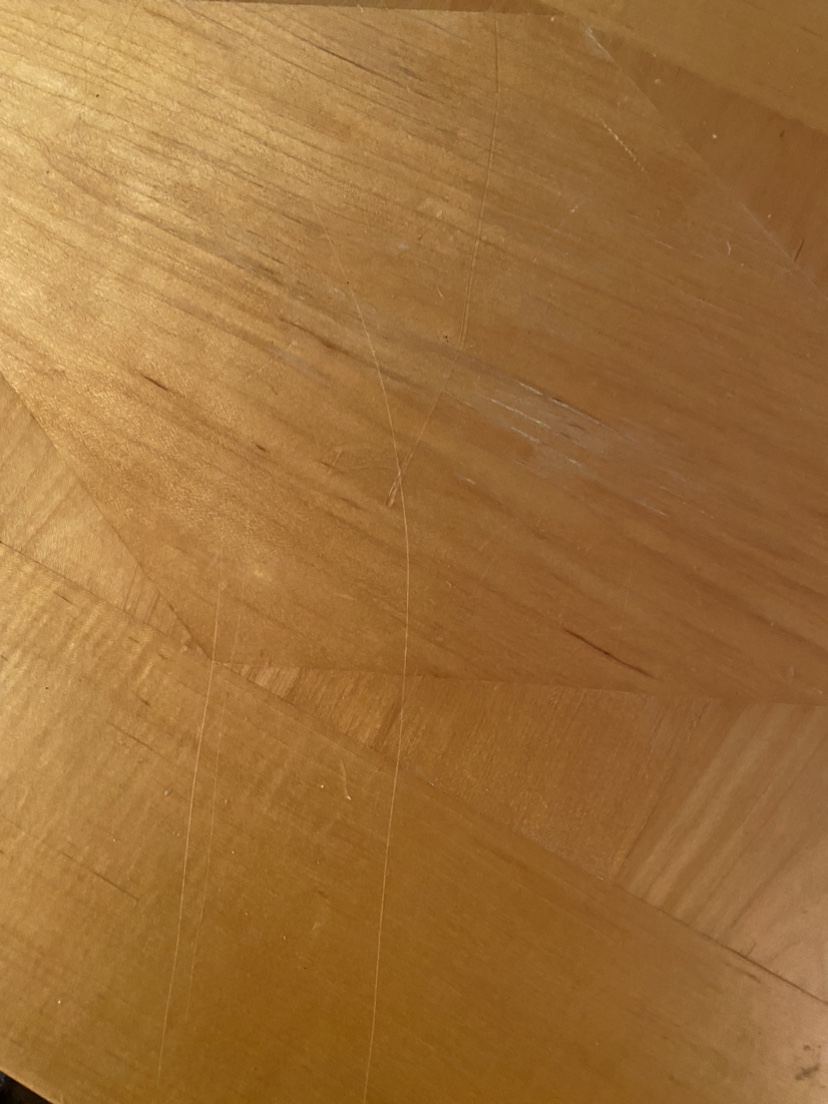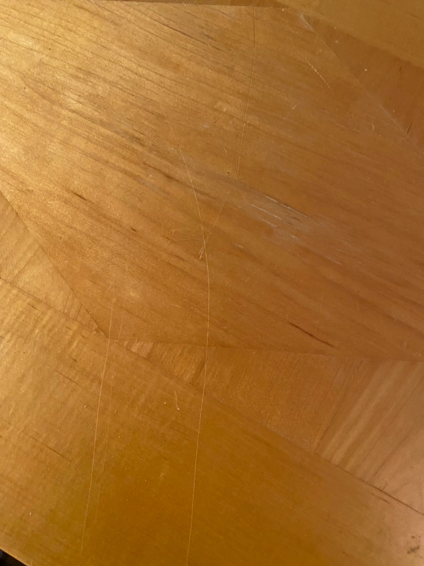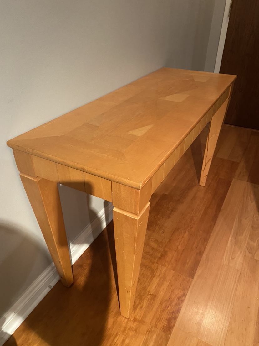 This is a solid wood console table. It features a natural wood finish and four legs. It is in good condition, with some minor scratches - see photos.