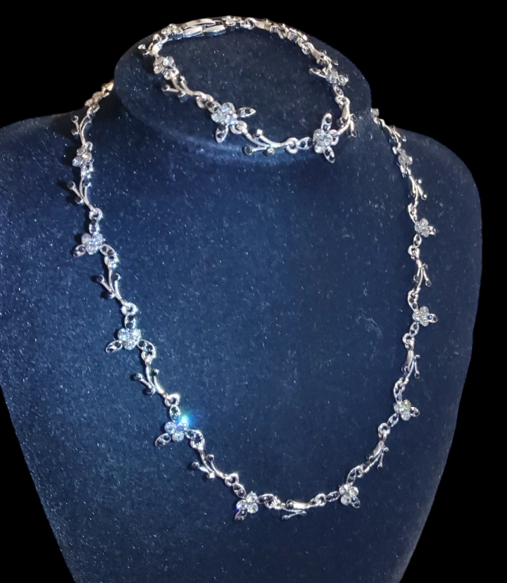 This is a beautiful silver necklace and bracelet set with a floral design. Vintage. Black onyx and clear crystals rhinestones They are both in good condition. Bracelet size 6.2inches and necklace size- 16 inches. Marked MR. non magnetic.