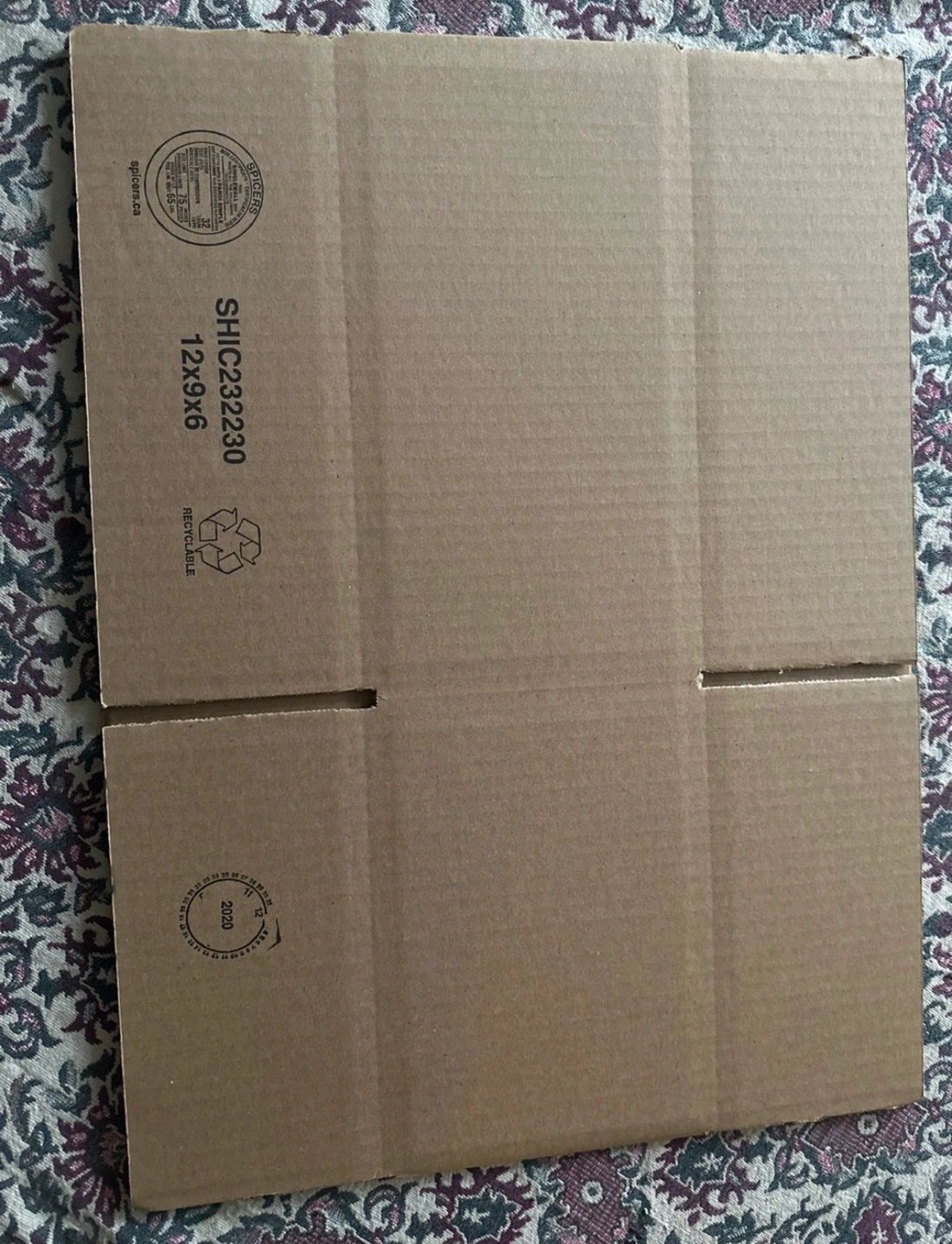 Empty cardboard box. Recyclable. 12 x 9 x 6 inches. Great for moving or storage.