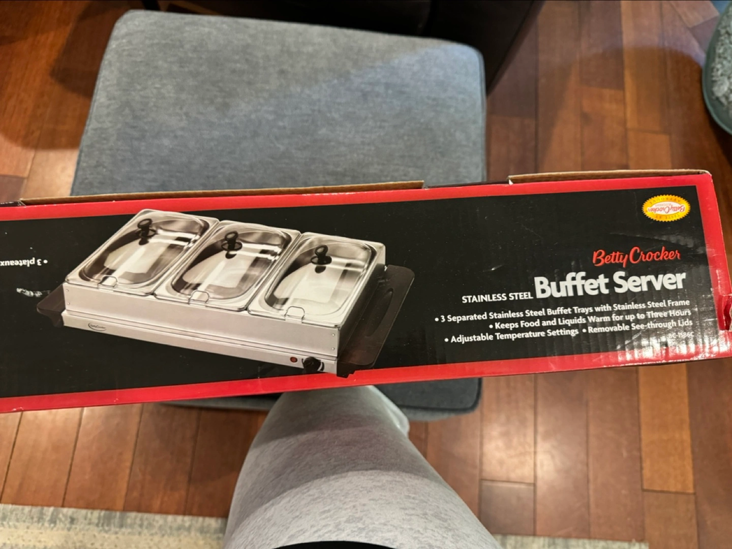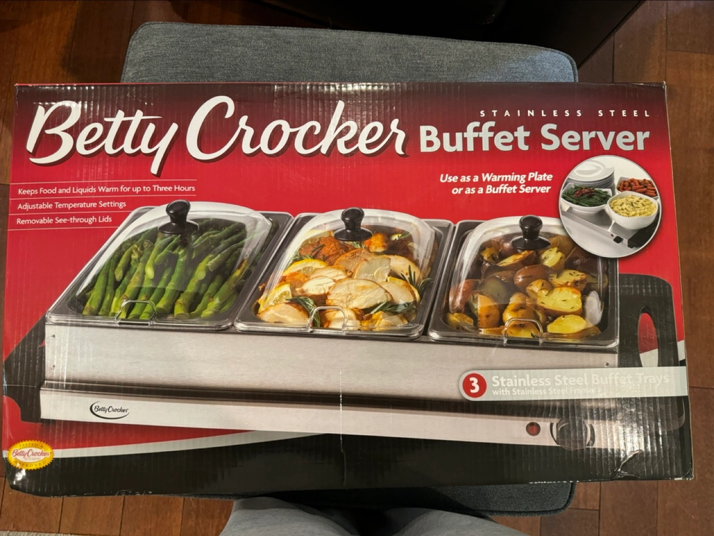 Stainless steel buffet server with three removable trays and lids. Keeps food warm for up to three hours. Adjustable temperature settings.BRAND NEW in box. Sealed . Selling for a senior friend and price will not be reduced.