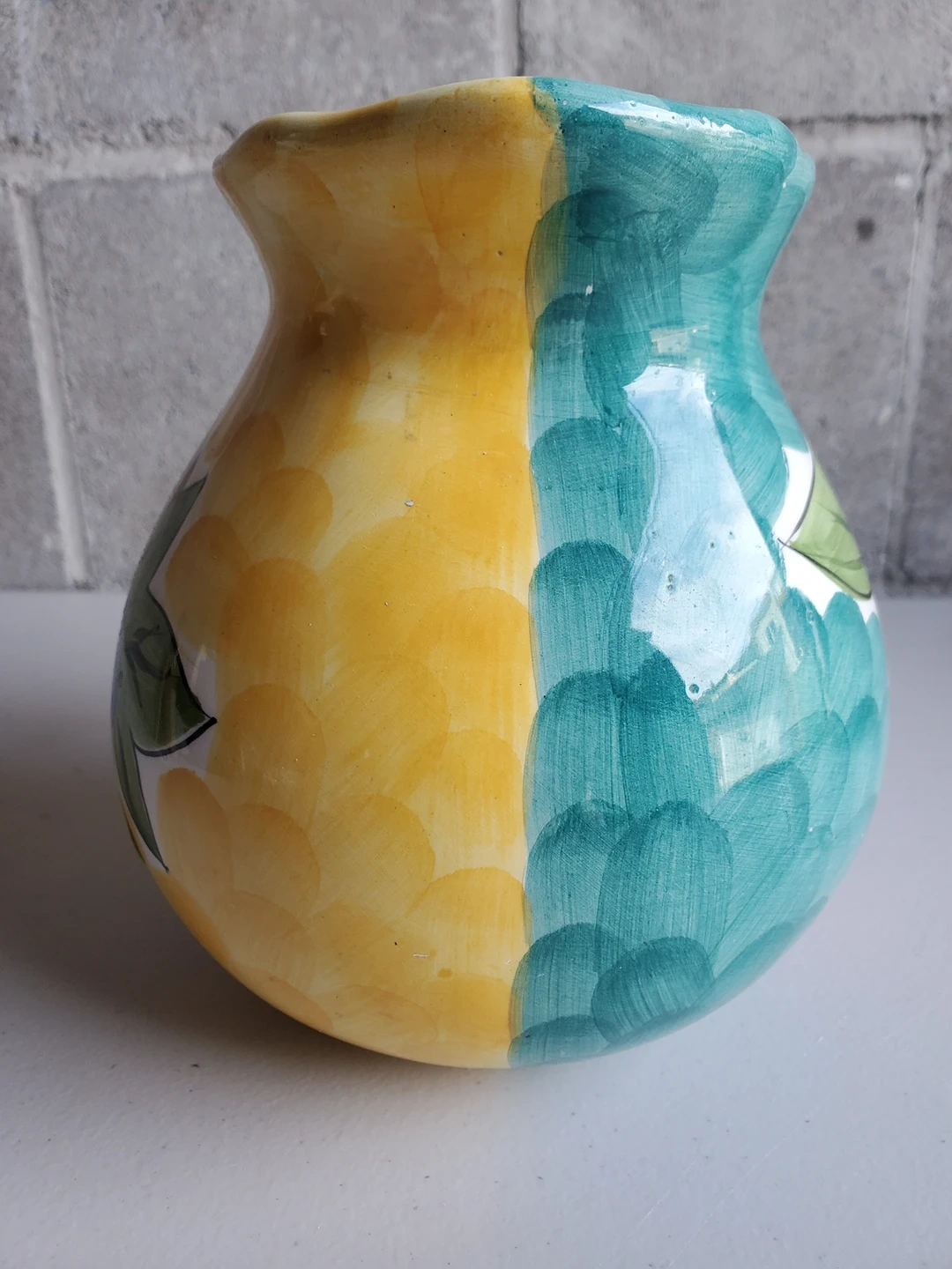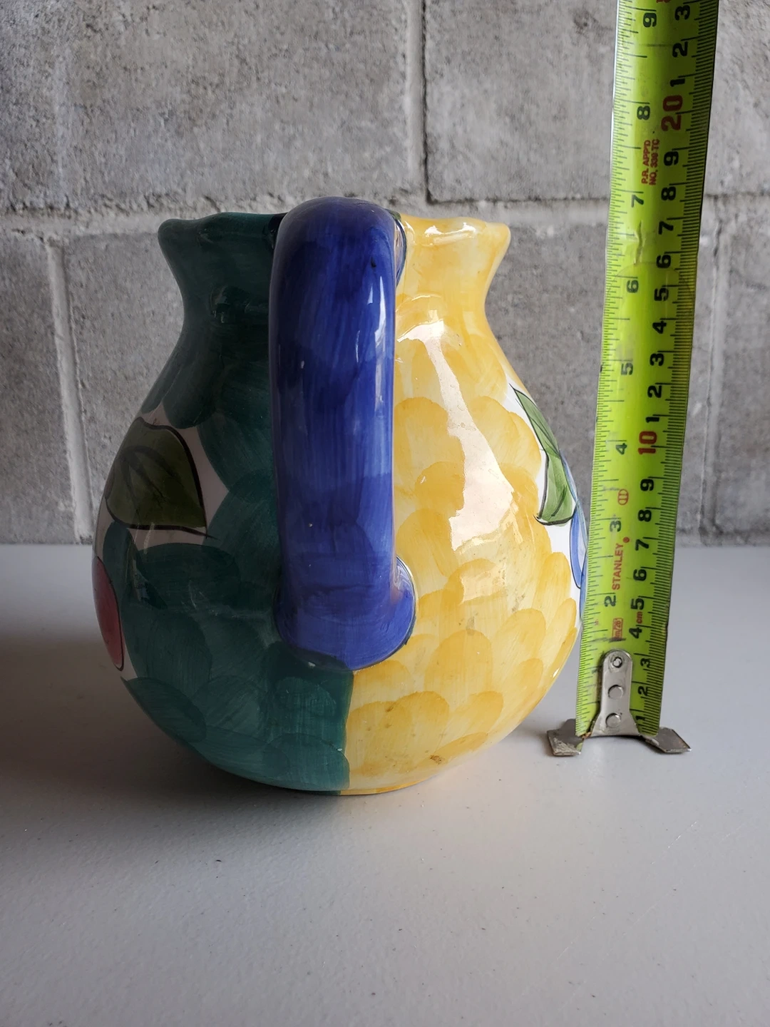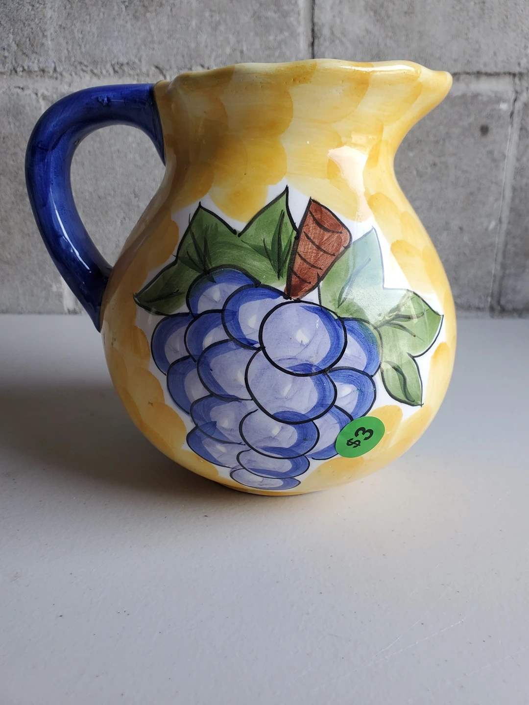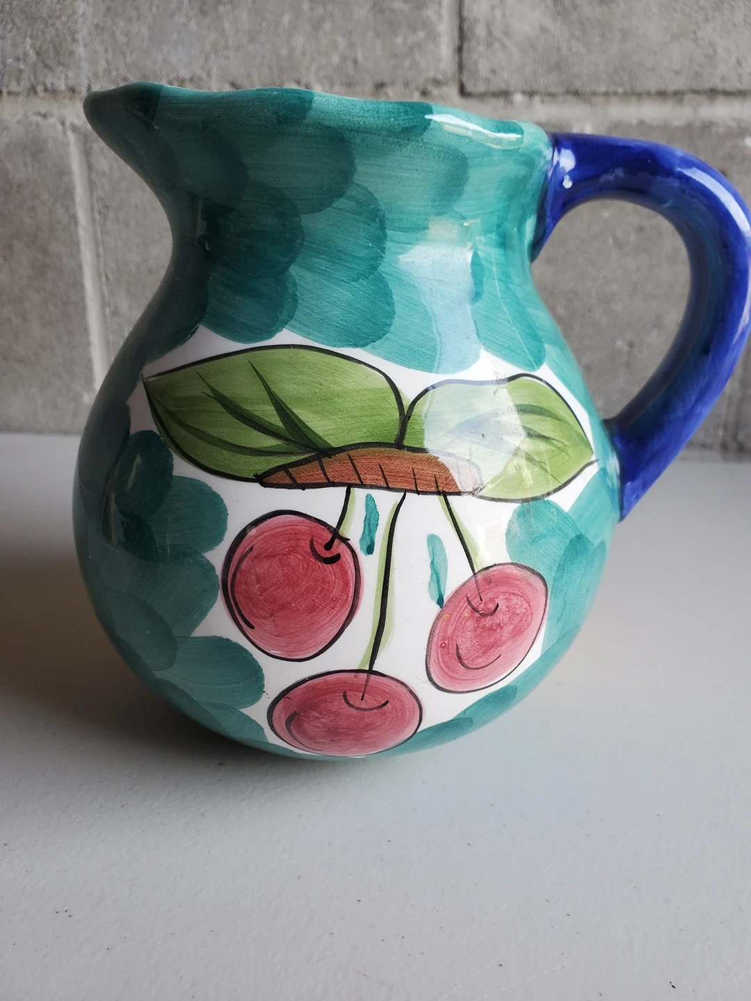 Funky, colourful pitcher for your fresh Summer flowers or refreshing juice. One side has a picture of cherriesπ and the other side is purple grapes π . No chips or breaks(ceramic). Height of pitcher is in the photos above. Meet up at Dufferin and Bloor or drop off if in the area.
