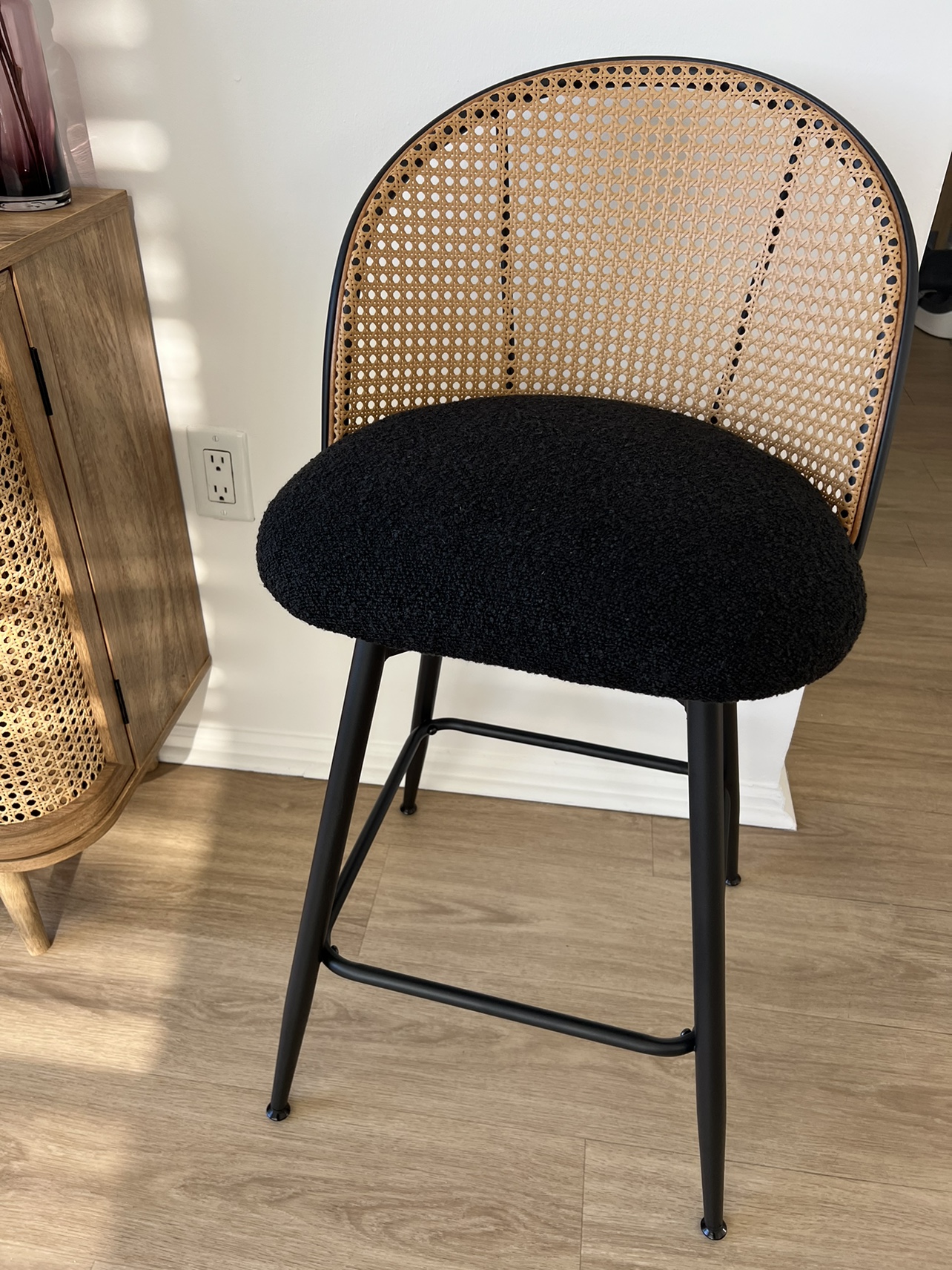 Black counter stool with a cane back (rattan) and a black boucle cushioned seat. The stool has a black metal frame. The stool is brand new.