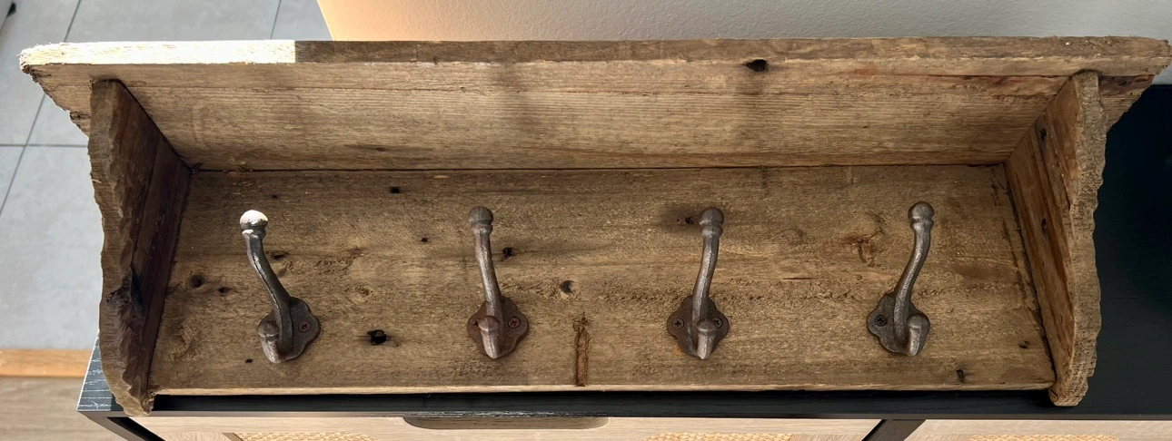 Wooden shelf with four metal hooks. The shelf has a rustic style and would be perfect for a mudroom, entryway or bathroom. It is made of reclaimed wood and has a natural finish. The hooks are made of metal and are in good condition. I am giving it away because I recently moved into a new place and can’t find a place for it!